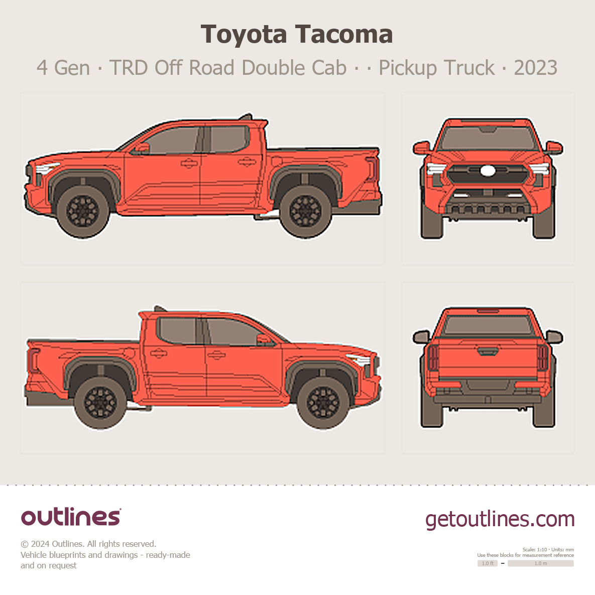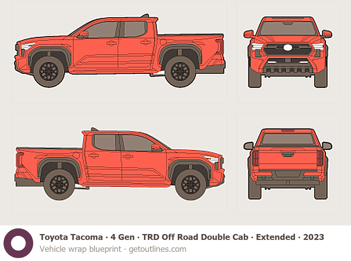 Buy this Toyota Tacoma 4 Gen blueprint and line drawing in high-quality editable vector file formats. Best for 3D and car wrap design.