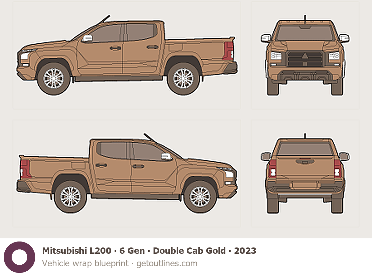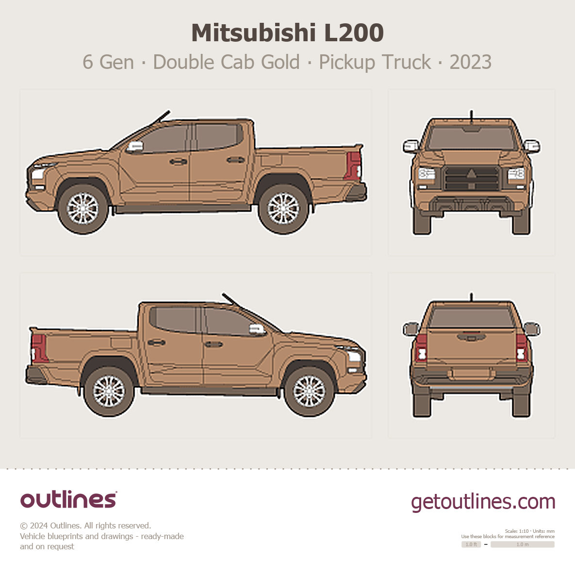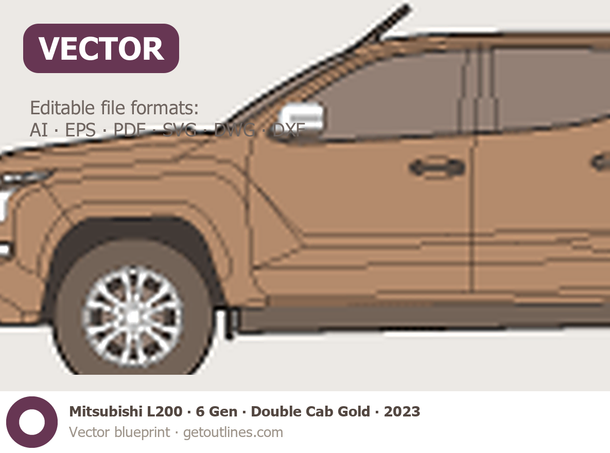 Buy this Mitsubishi L200 6 Gen blueprint and line drawing in high-quality editable vector file formats. Best for 3D and car wrap design.