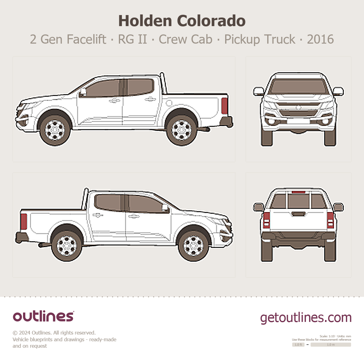 This is a blueprint of the Colorado, produced by carmaker Holden in 2016 - Present (2025, 2026). It features a Pickup Truck body design and is classified as a Commercial vehicle.