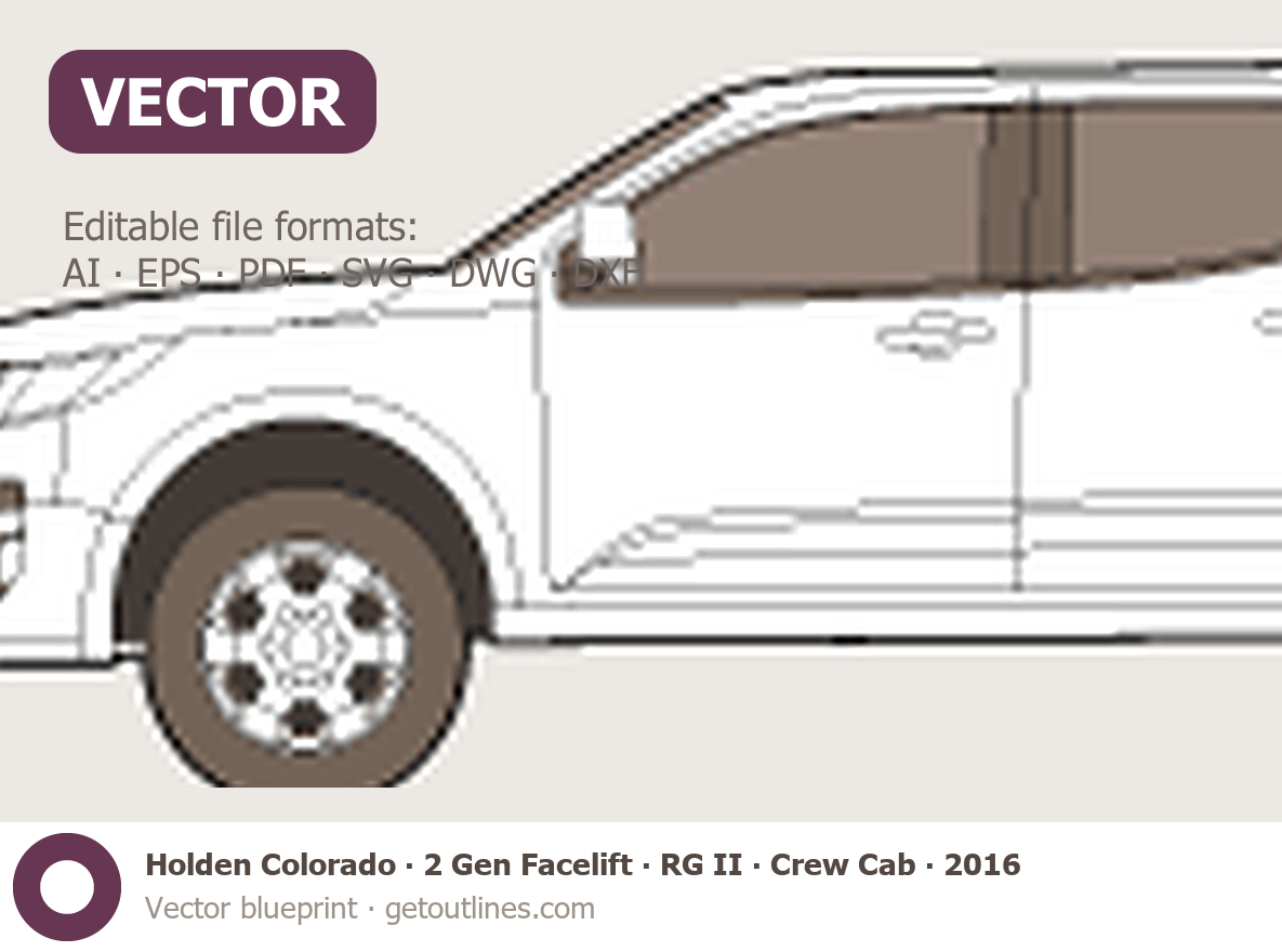 This 2016 Holden Colorado 2 Gen Facelift ∙ RG II Crew Cab Pickup Truck blueprint helps designers, wrap studios, and 3D artists simplify their workflow and save valuable time for creative work instead of routine tasks.