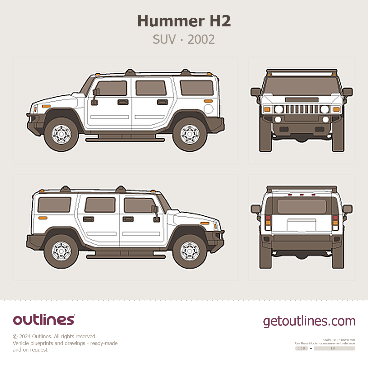This is a blueprint of the H2, produced by carmaker Hummer in 2002 - 2009. It features a SUV body design and is classified as a Offroad vehicle.