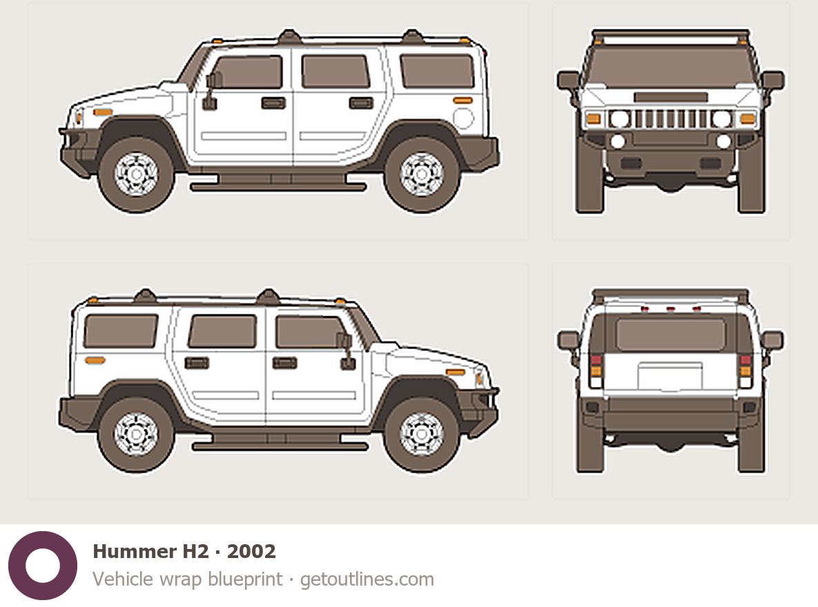 This 2002 Hummer H2 SUV blueprint helps designers, wrap studios, and 3D artists simplify their workflow and save valuable time for creative work instead of routine tasks.