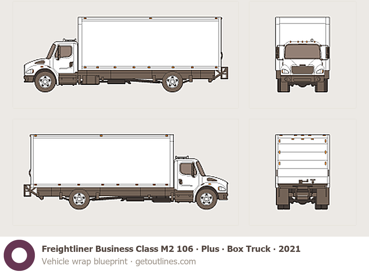 This 2021 Freightliner Business Class M2 106 Plus Box Truck Heavy Truck blueprint helps designers, wrap studios, and 3D artists simplify their workflow and save valuable time for creative work instead of routine tasks.