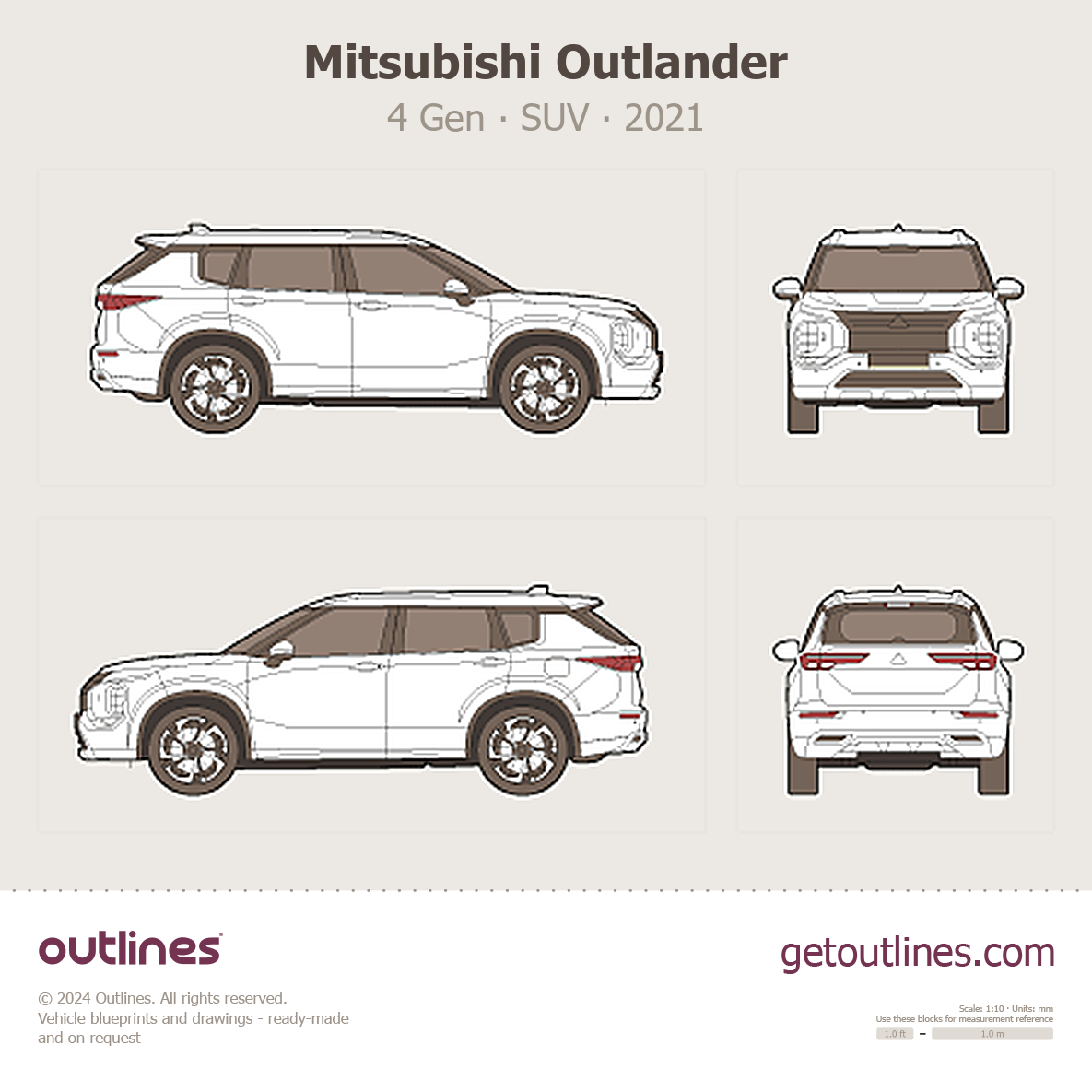This is a blueprint of the Outlander, produced by carmaker Mitsubishi in 2021 - 2025. It features a SUV body design and is classified as a Crossover vehicle.