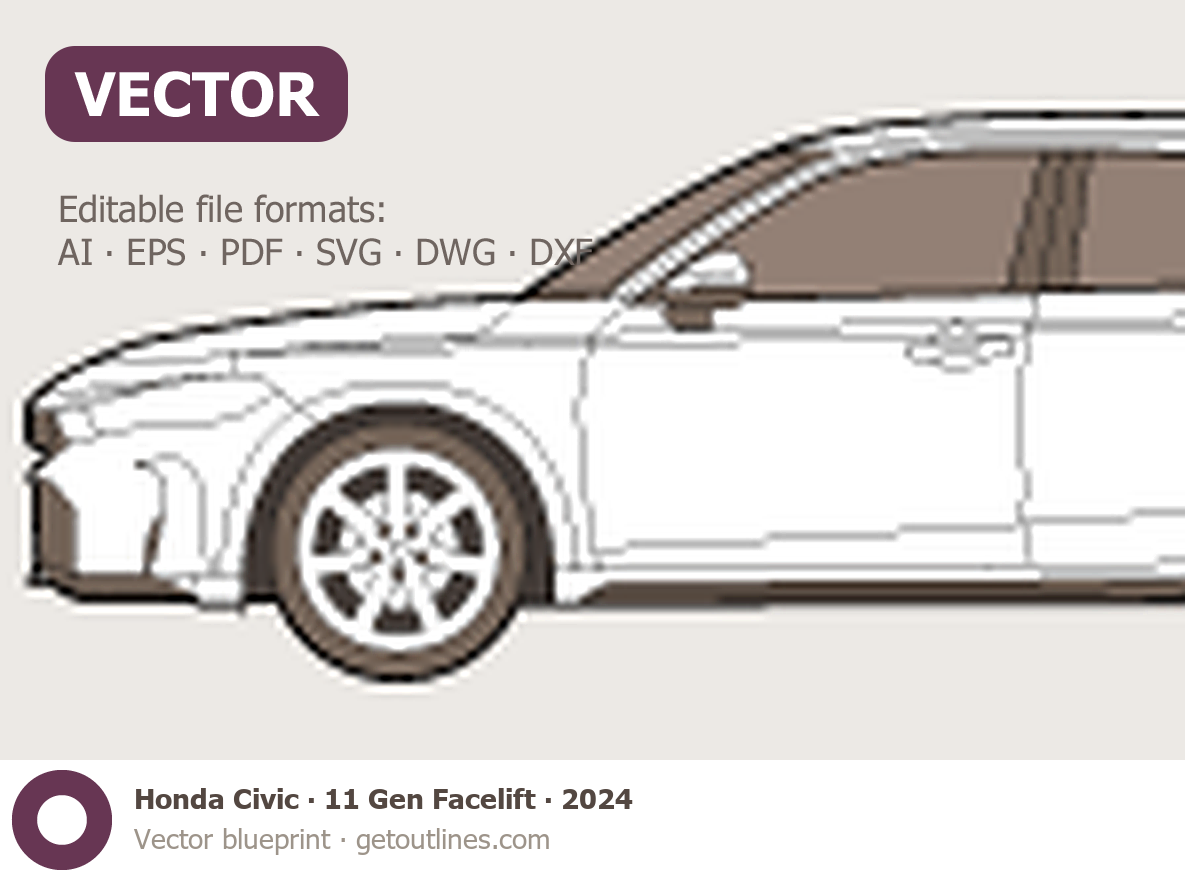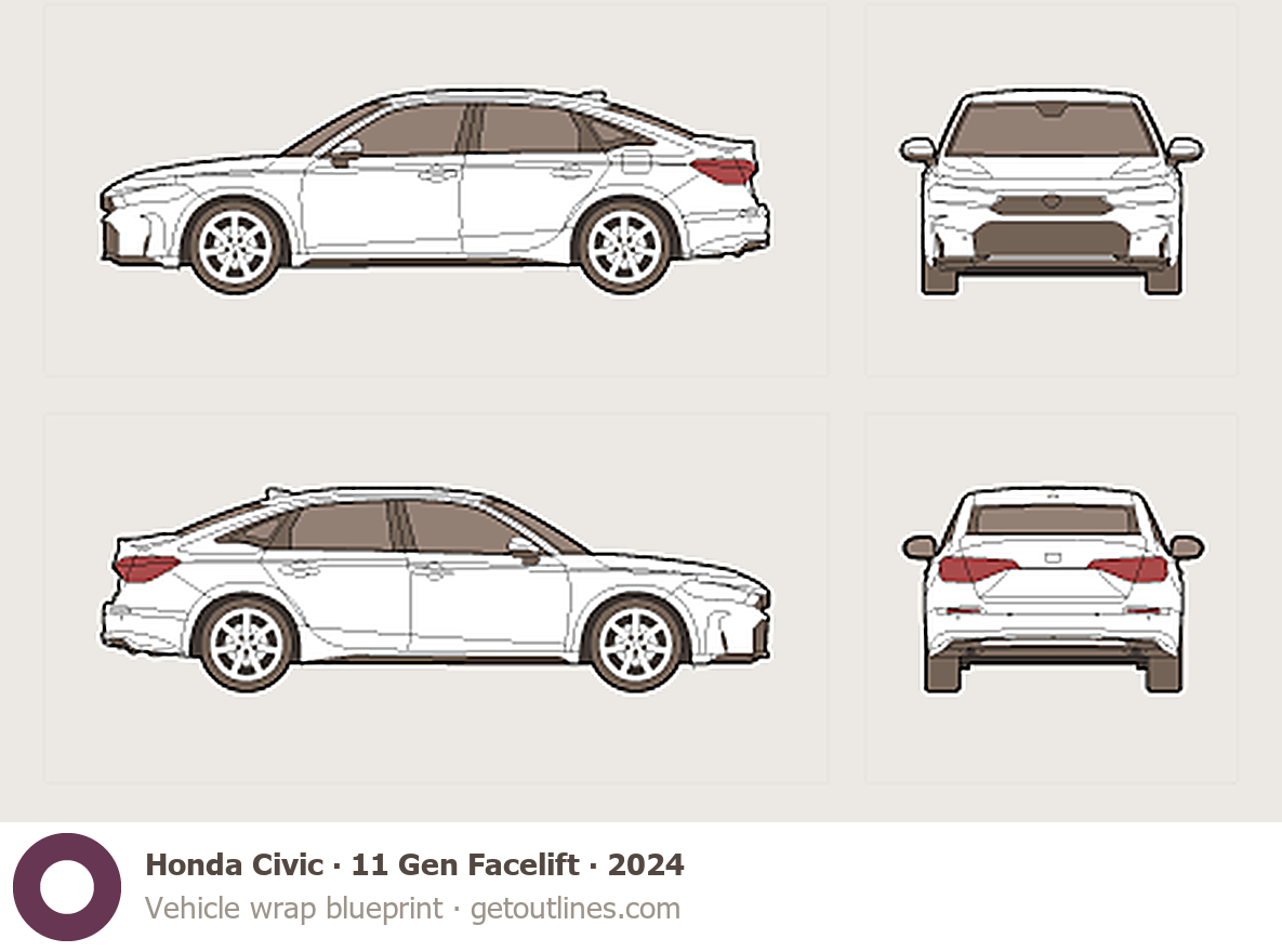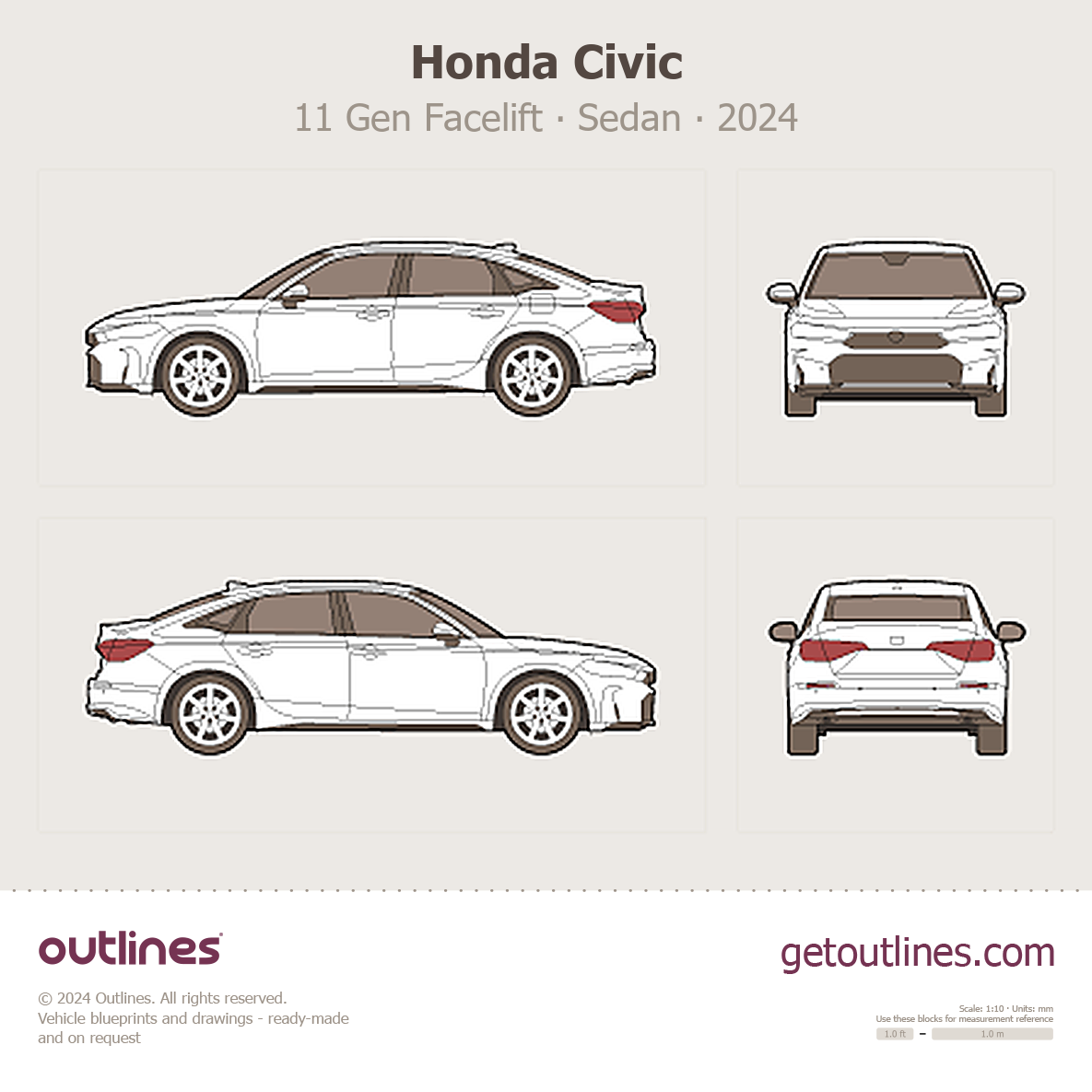 Buy this Honda Civic 11 Gen Facelift blueprint and line drawing in high-quality editable vector file formats. Best for 3D and car wrap design.