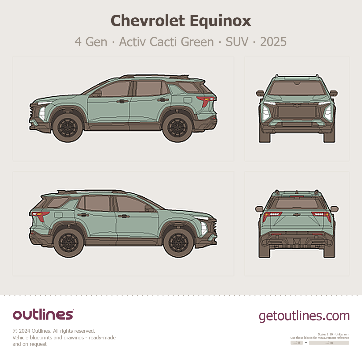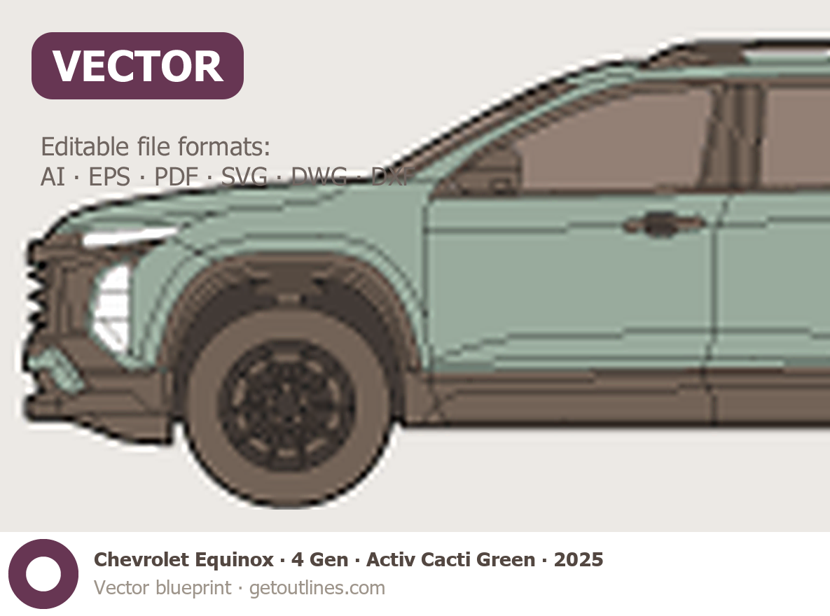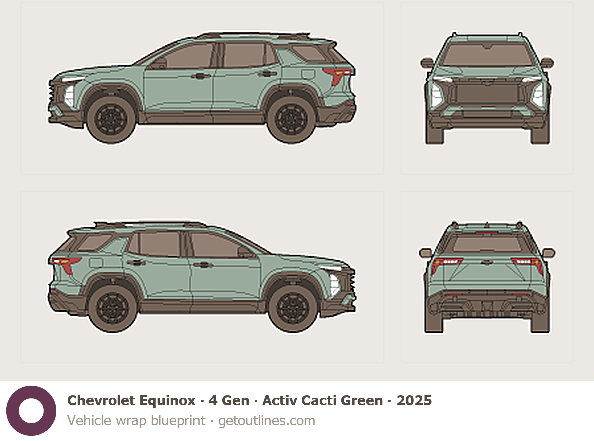 This 2025 Chevrolet Equinox 4 Gen Activ Cacti Green SUV blueprint helps designers, wrap studios, and 3D artists simplify their workflow and save valuable time for creative work instead of routine tasks.