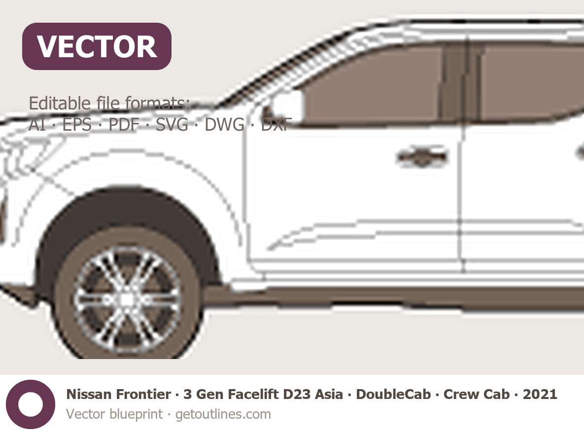 Buy this Nissan Frontier 3 Gen Facelift D23 Asia blueprint and line drawing in high-quality editable vector file formats. Best for 3D and car wrap design.