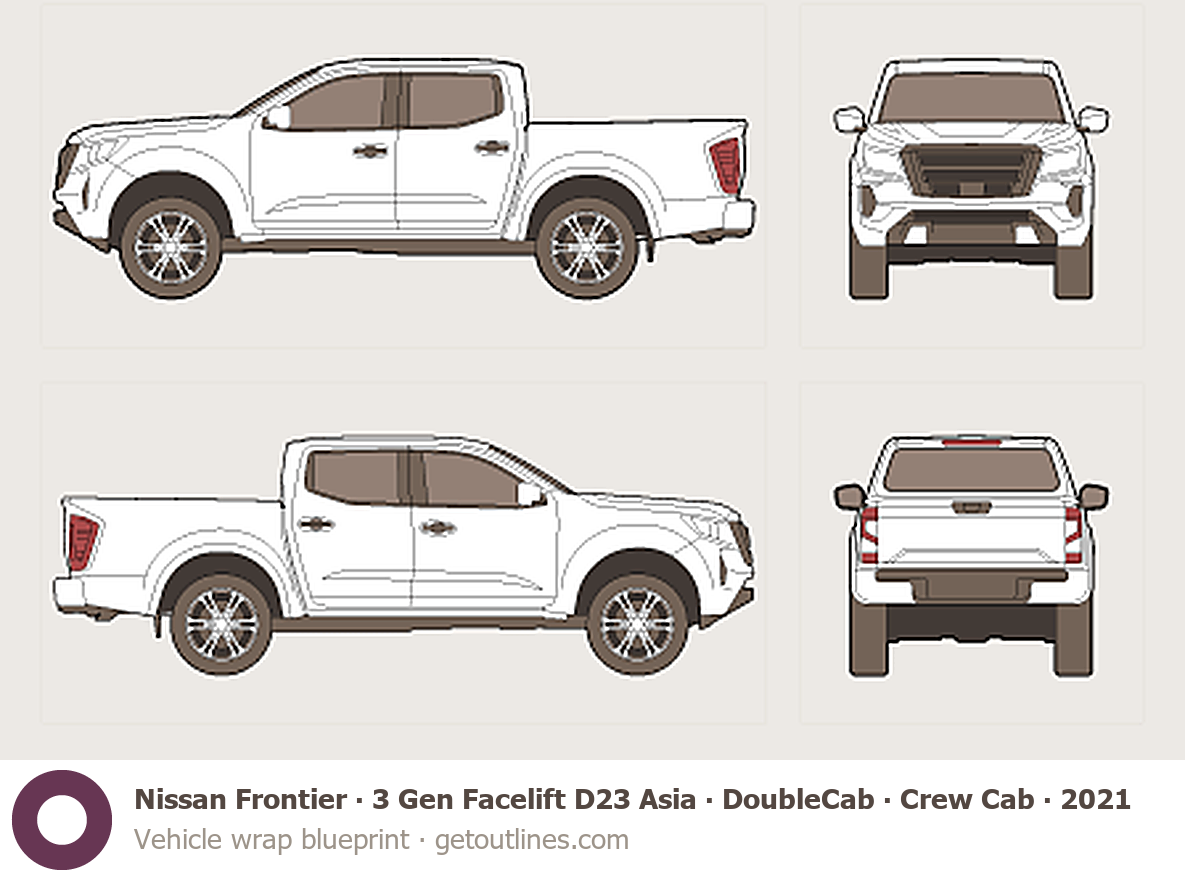 This 2021 Nissan Frontier 3 Gen Facelift D23 Asia DoubleCab ∙ Crew Cab Pickup Truck blueprint helps designers, wrap studios, and 3D artists simplify their workflow and save valuable time for creative work instead of routine tasks.