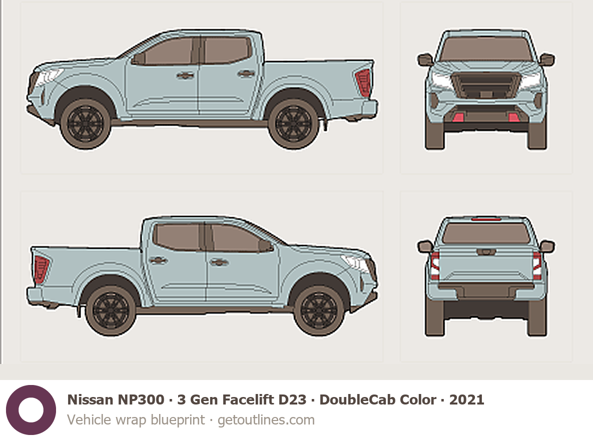 This 2021 Nissan NP300 3 Gen Facelift D23 DoubleCab Color Pickup Truck blueprint helps designers, wrap studios, and 3D artists simplify their workflow and save valuable time for creative work instead of routine tasks.