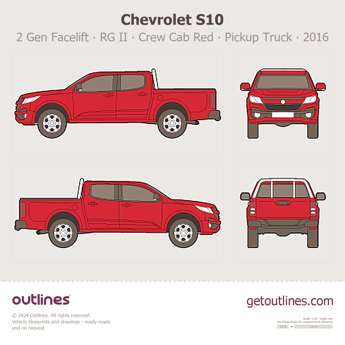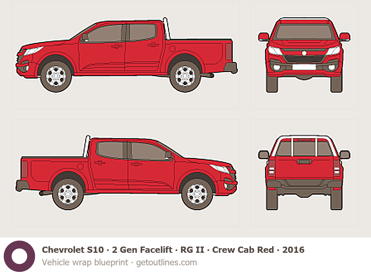 This 2016 Chevrolet S10 2 Gen Facelift ∙ RG II Crew Cab Red Pickup Truck blueprint helps designers, wrap studios, and 3D artists simplify their workflow and save valuable time for creative work instead of routine tasks.