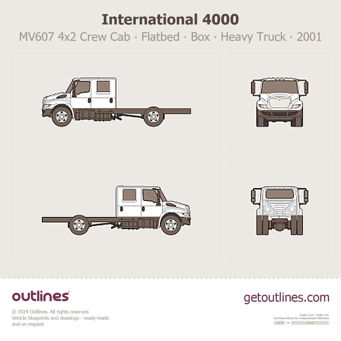 This 2001 International 4000 MV607 4x2 Crew Cab ∙ Flatbed ∙ Box Truck ∙ Dump Truck ∙ Service Truck ∙ Utility Truck Heavy Truck blueprint helps designers, wrap studios, and 3D artists simplify their workflow and save valuable time for creative work instead of routine tasks.