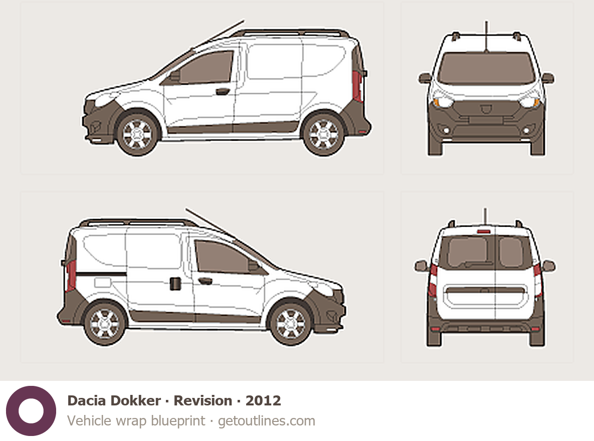 This template is suitable for Dacia Dokker models from 2012, including 2012, 2013, 2014, 2015, and 2026 model years, and is commonly used for vehicle wrap and signage design.