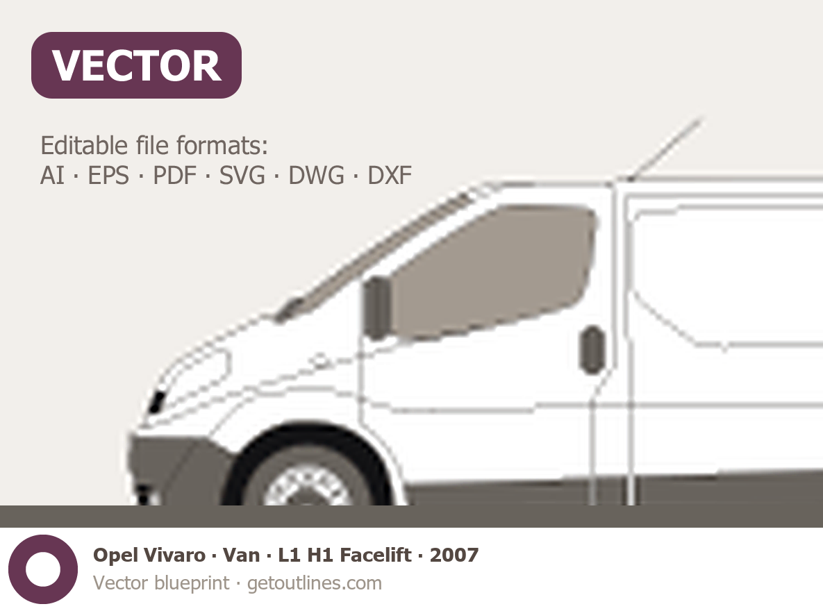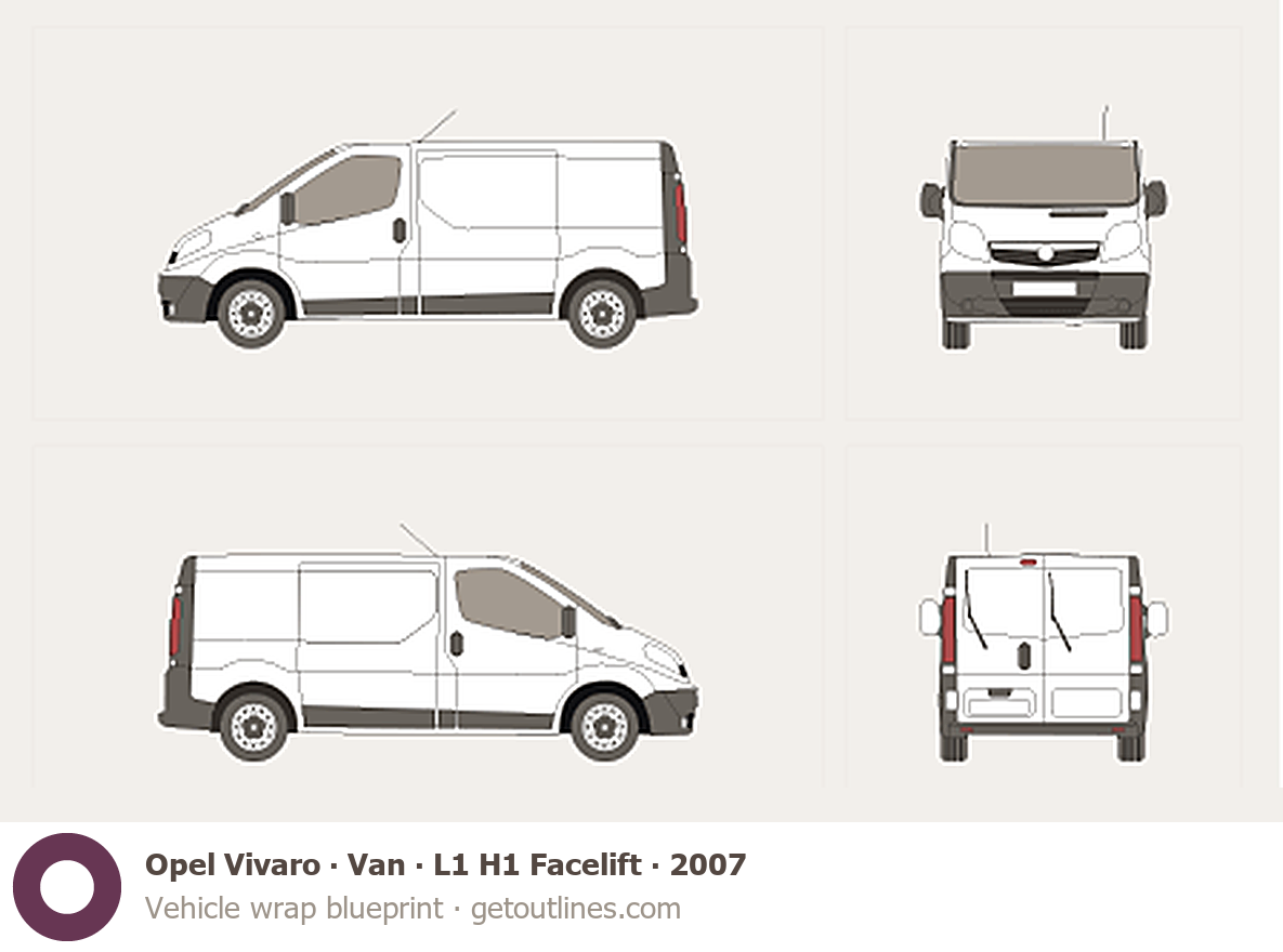 This 2007 Opel Vivaro Van L1 H1 Facelift Van blueprint helps designers, wrap studios, and 3D artists simplify their workflow and save valuable time for creative work instead of routine tasks.