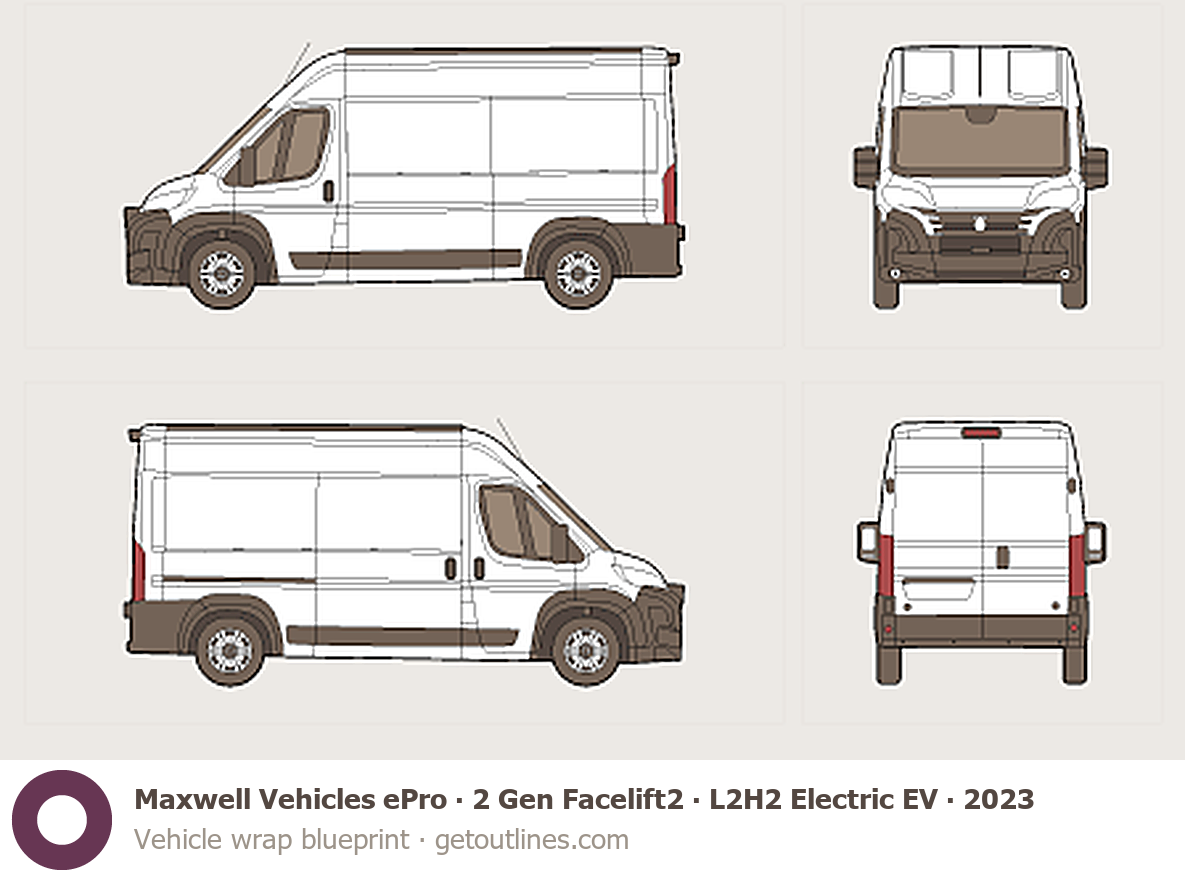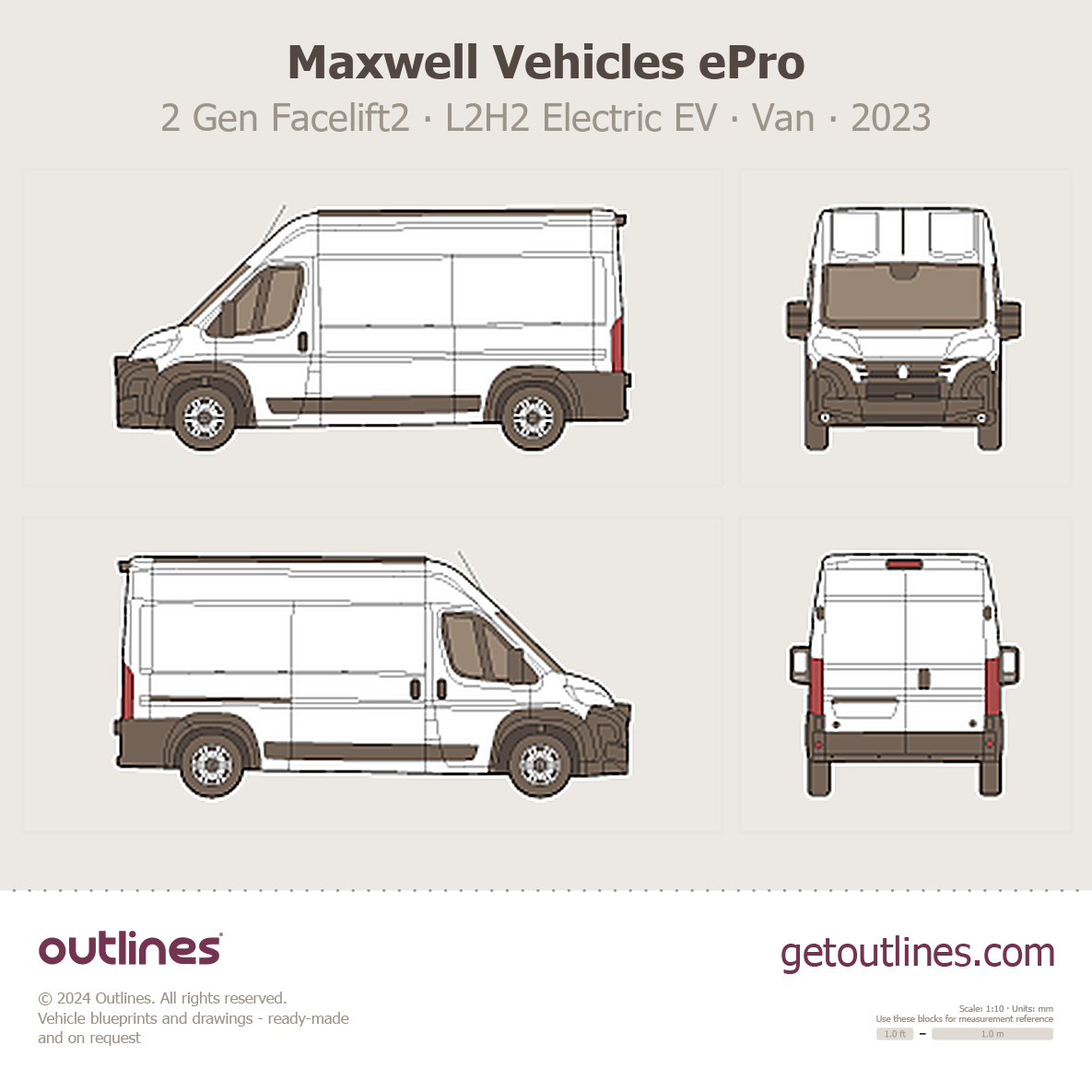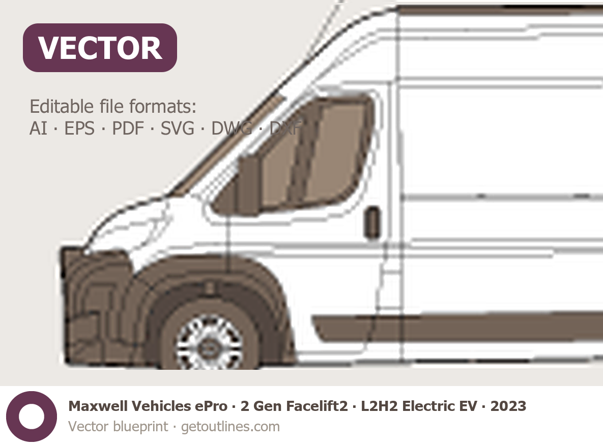 Buy this Maxwell Vehicles ePro 2 Gen Facelift2 blueprint and line drawing in high-quality editable vector file formats. Best for 3D and car wrap design.