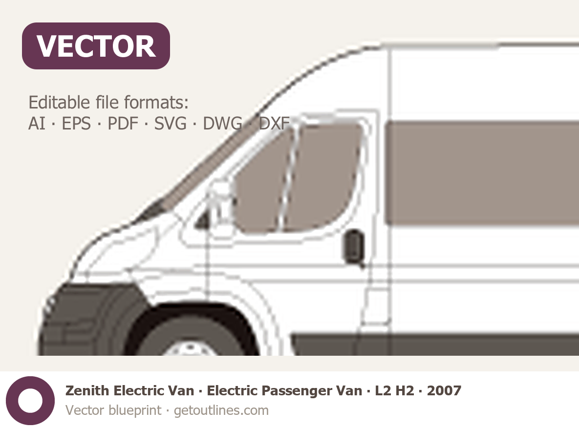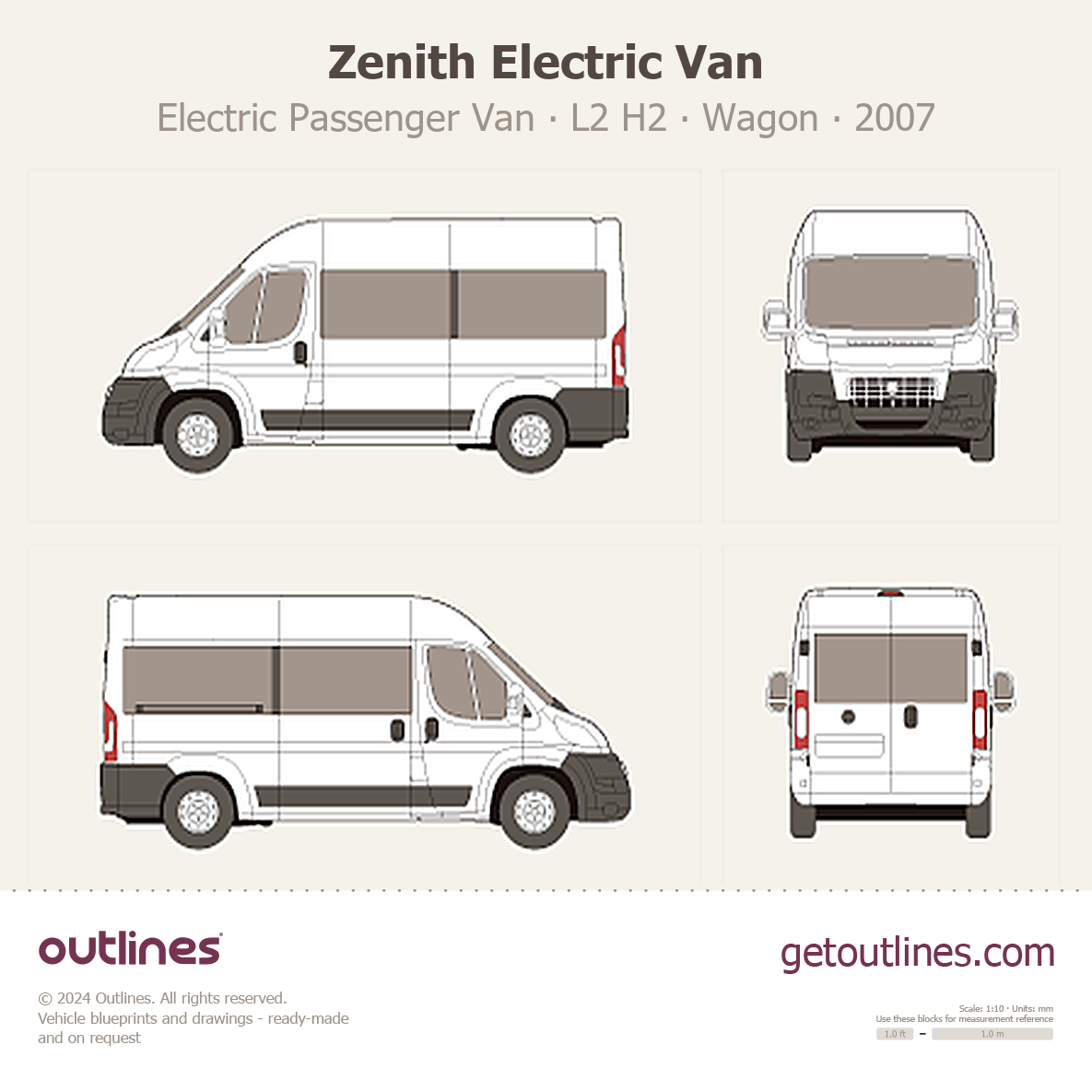 This 2007 Zenith Electric Van Electric Passenger Van L2 H2 Wagon blueprint helps designers, wrap studios, and 3D artists simplify their workflow and save valuable time for creative work instead of routine tasks.