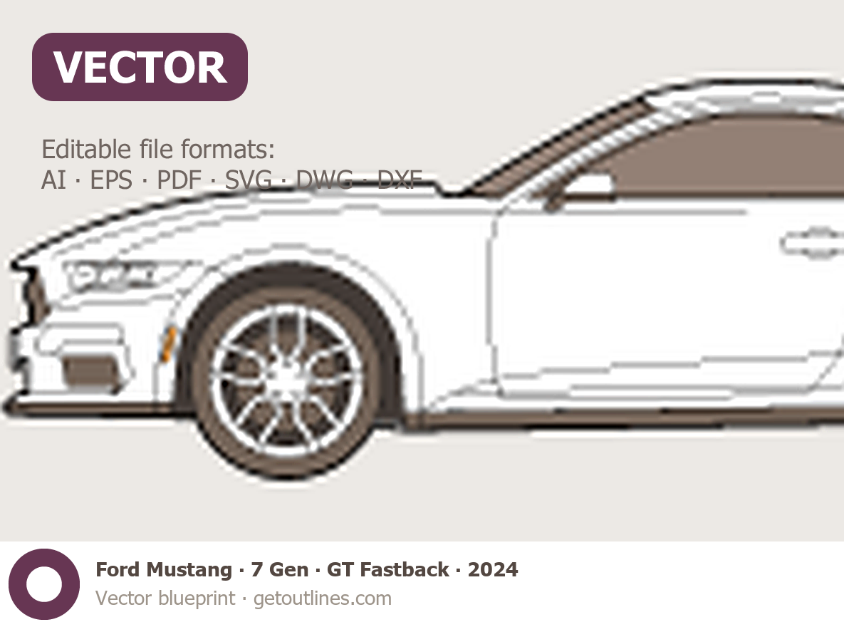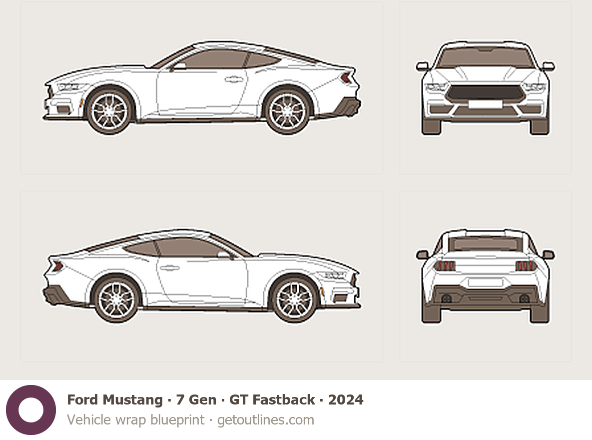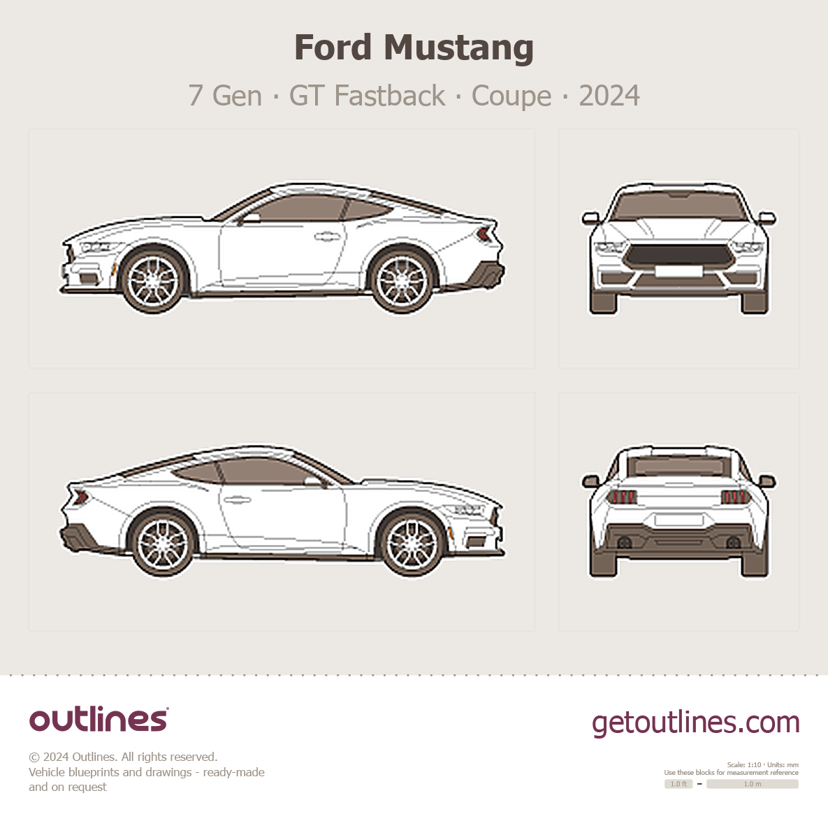 Buy this Ford Mustang 7 Gen blueprint and line drawing in high-quality editable vector file formats. Best for 3D and car wrap design.