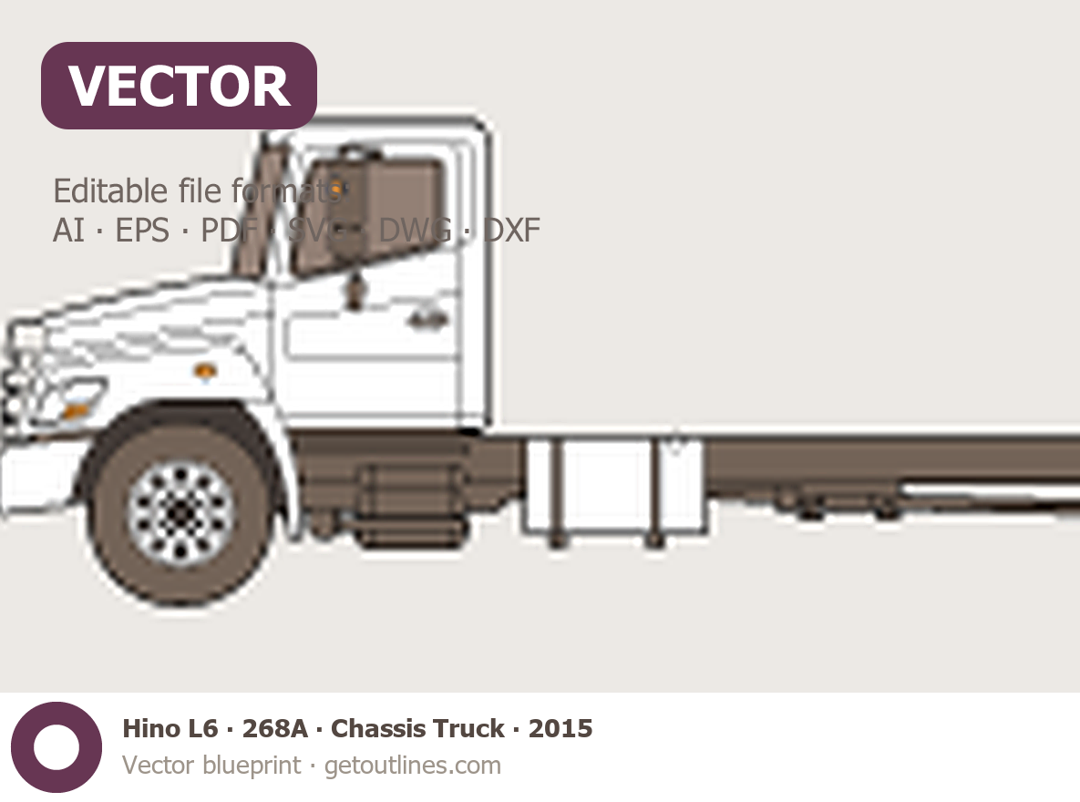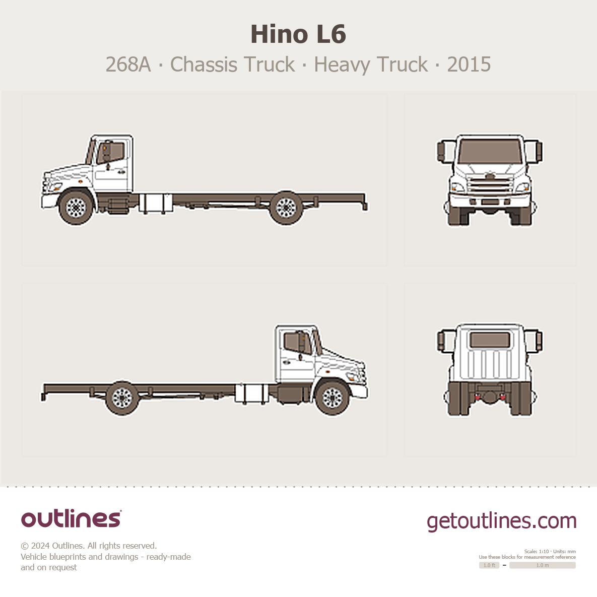 This 2015 Hino L6 268A ∙ Chassis Truck Heavy Truck blueprint helps designers, wrap studios, and 3D artists simplify their workflow and save valuable time for creative work instead of routine tasks.