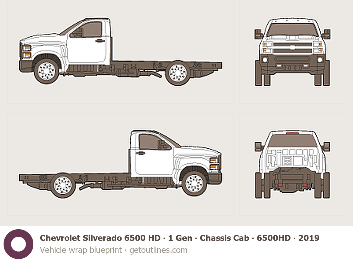 This 2019 Chevrolet Silverado 6500 HD 1 Gen Chassis Cab ∙ 6500HD Heavy Truck blueprint helps designers, wrap studios, and 3D artists simplify their workflow and save valuable time for creative work instead of routine tasks.