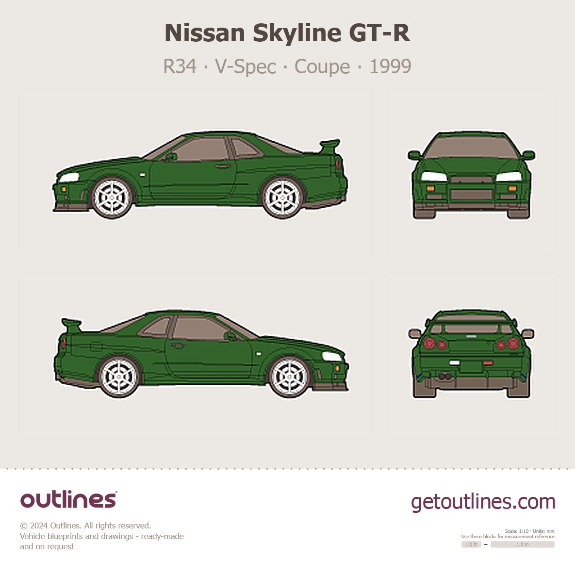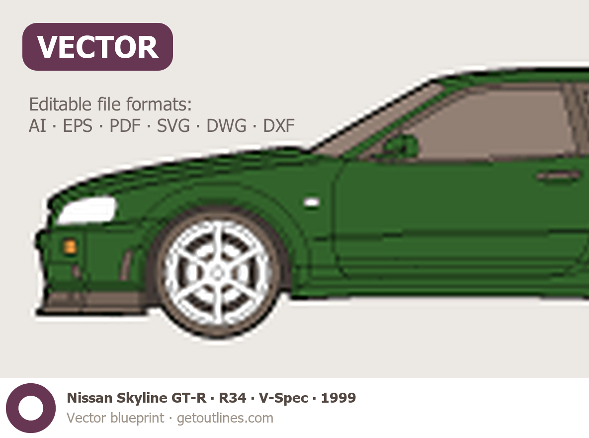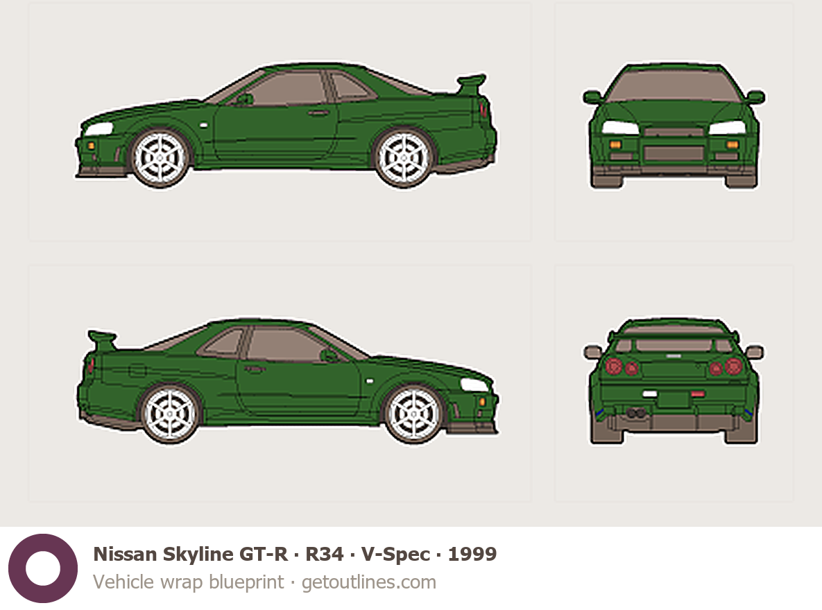 This 1999 Nissan Skyline GT-R R34 V-Spec Coupe blueprint helps designers, wrap studios, and 3D artists simplify their workflow and save valuable time for creative work instead of routine tasks.