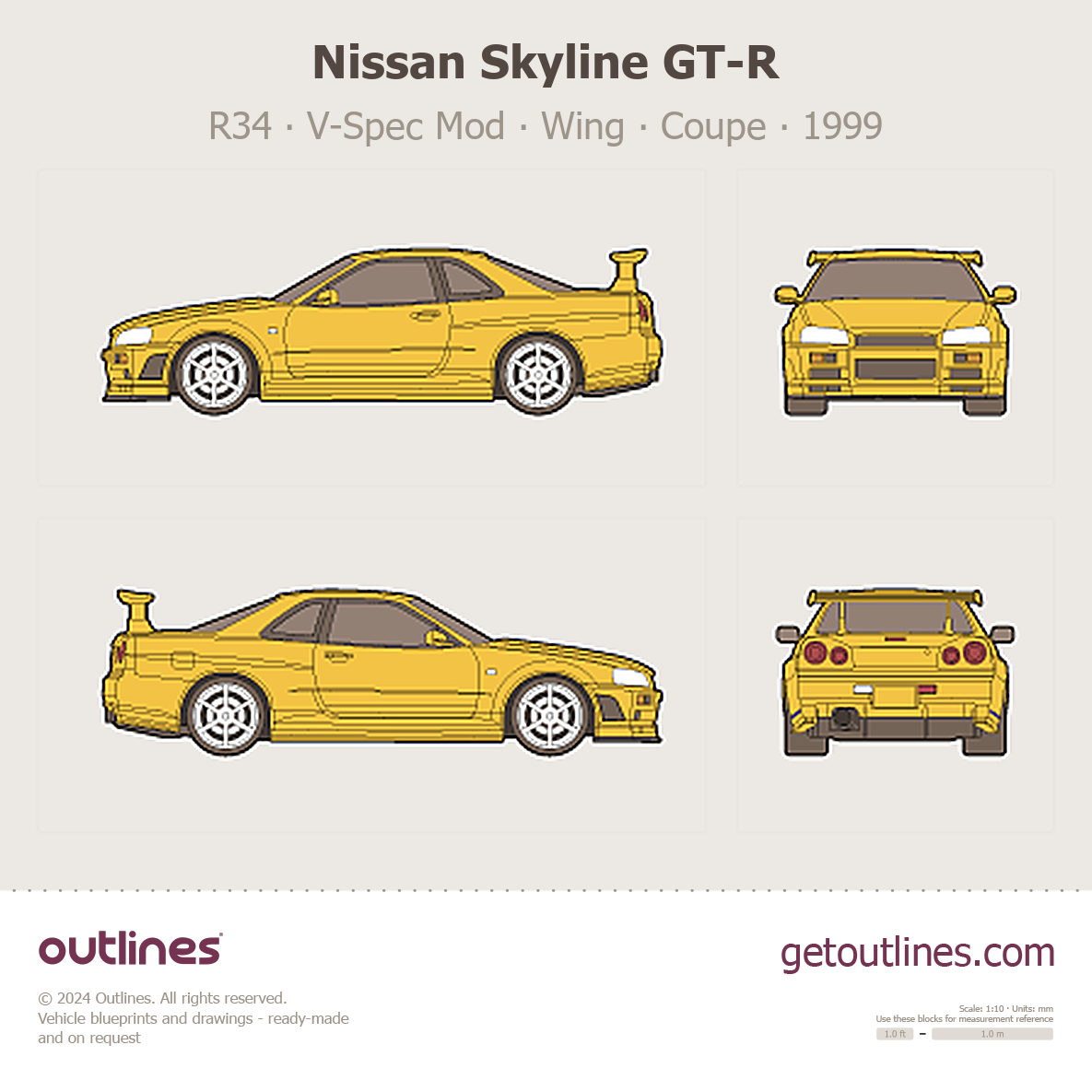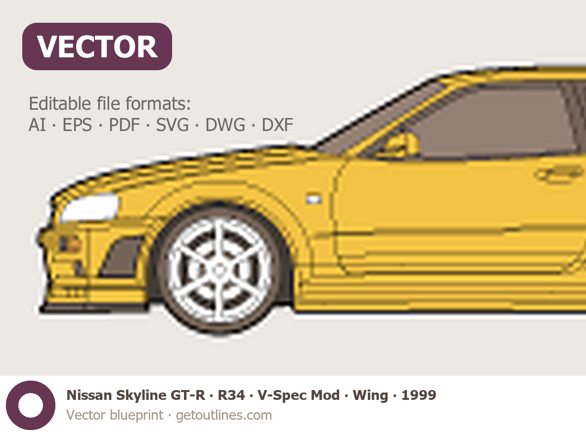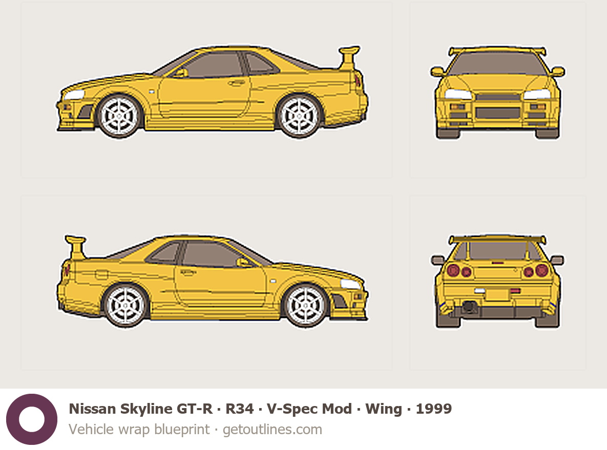 Buy this Nissan Skyline GT-R R34 blueprint and line drawing in high-quality editable vector file formats. Best for 3D and car wrap design.