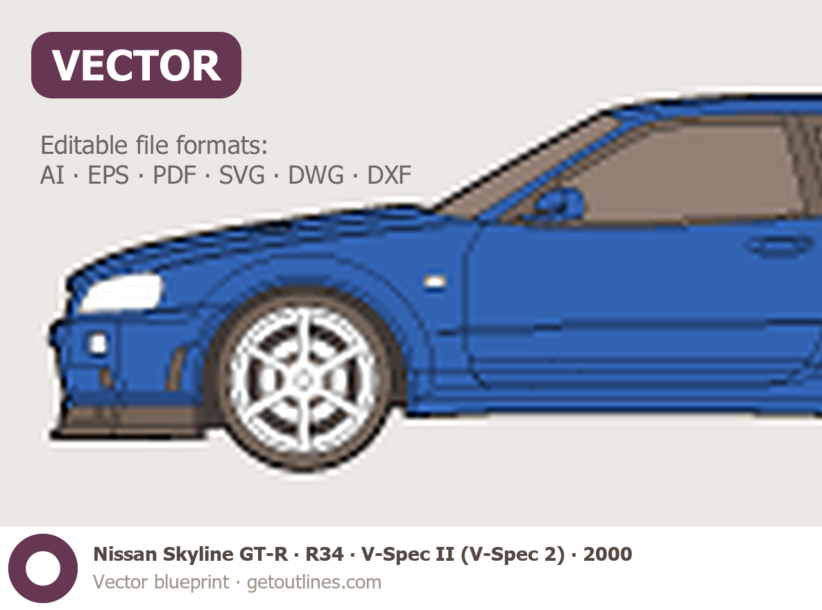 Buy this Nissan Skyline GT-R R34 blueprint and line drawing in high-quality editable vector file formats. Best for 3D and car wrap design.