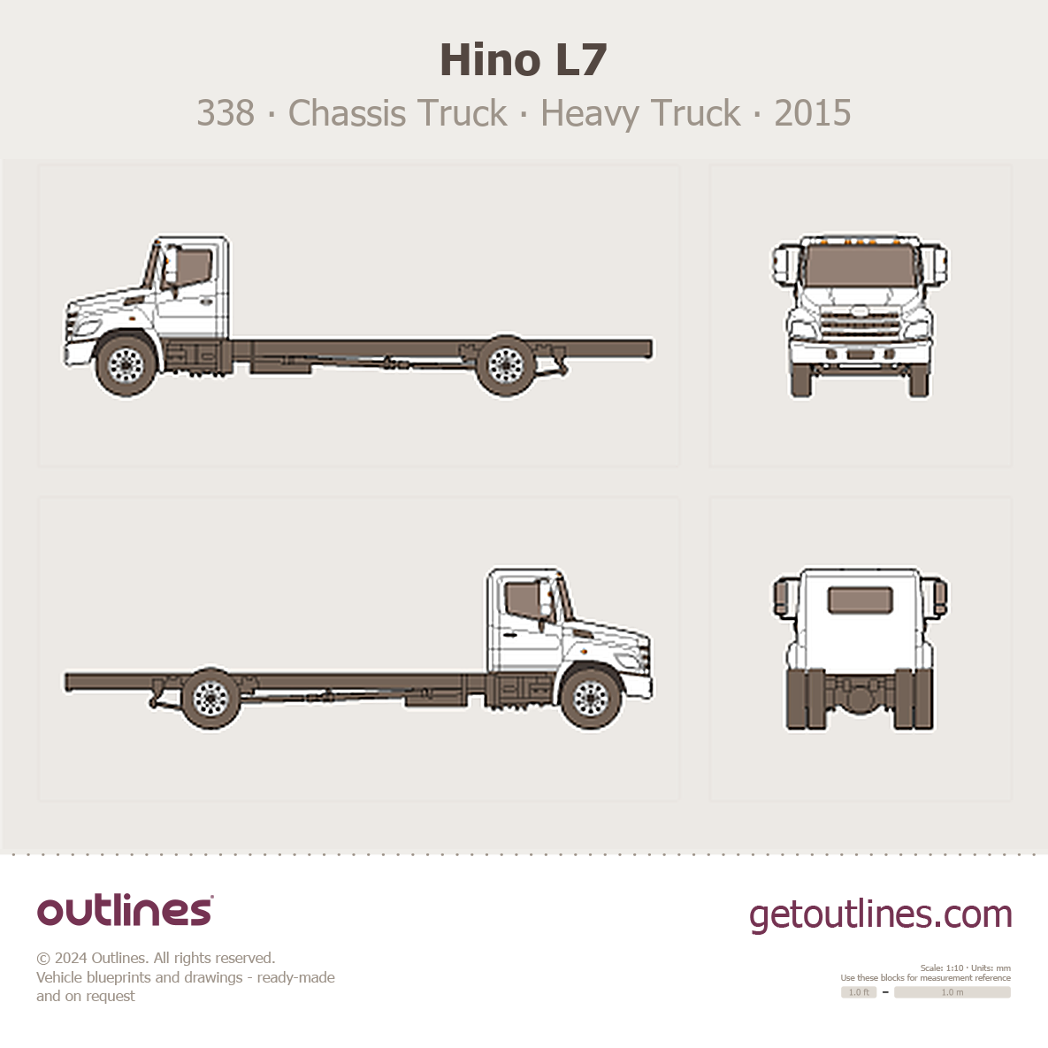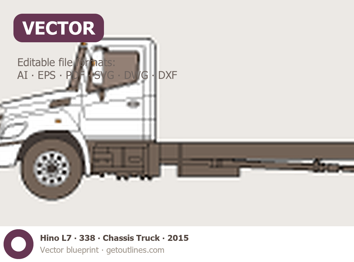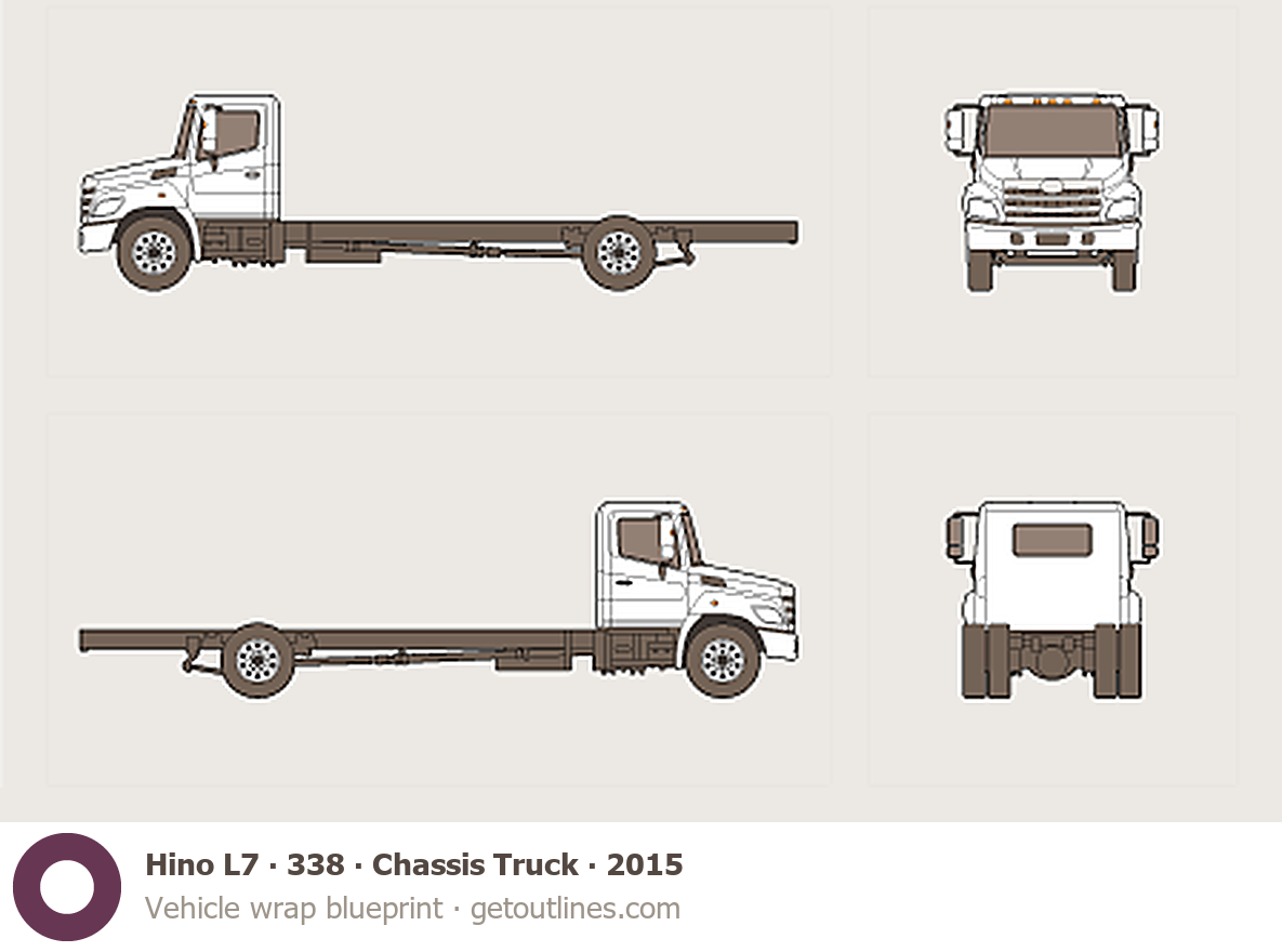 This 2015 Hino L7 338 ∙ Chassis Truck Heavy Truck blueprint helps designers, wrap studios, and 3D artists simplify their workflow and save valuable time for creative work instead of routine tasks.