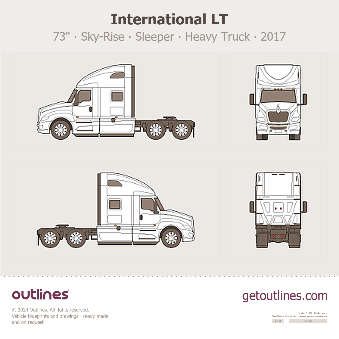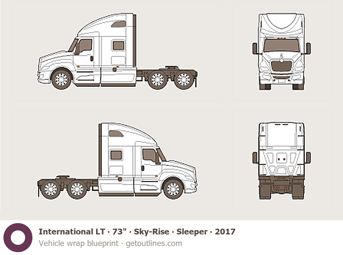 This 2017 International LT 73" ∙ Sky-Rise ∙ Sleeper Heavy Truck blueprint helps designers, wrap studios, and 3D artists simplify their workflow and save valuable time for creative work instead of routine tasks.