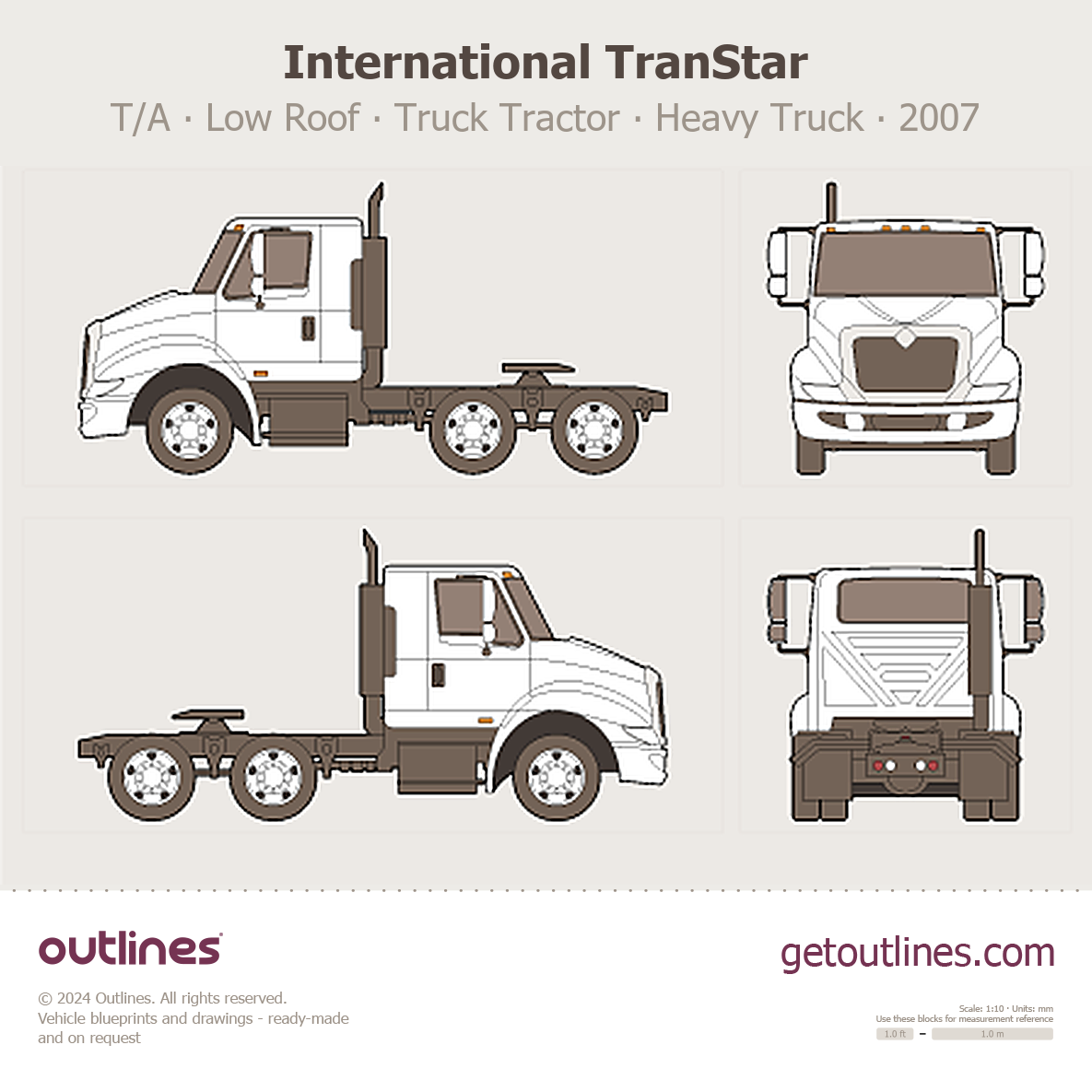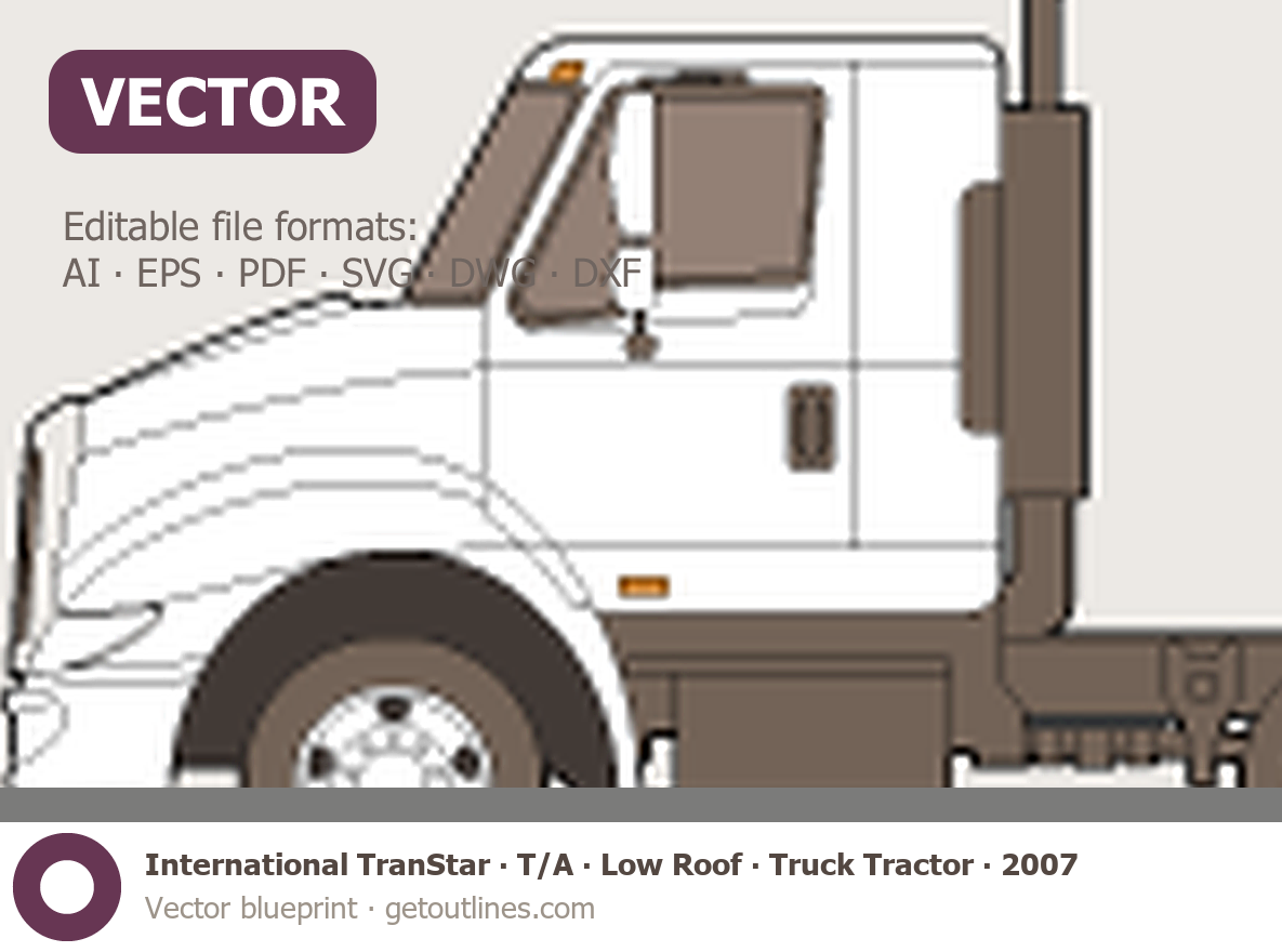 This 2007 International TranStar T/A ∙ Low Roof ∙ Truck Tractor Heavy Truck blueprint helps designers, wrap studios, and 3D artists simplify their workflow and save valuable time for creative work instead of routine tasks.