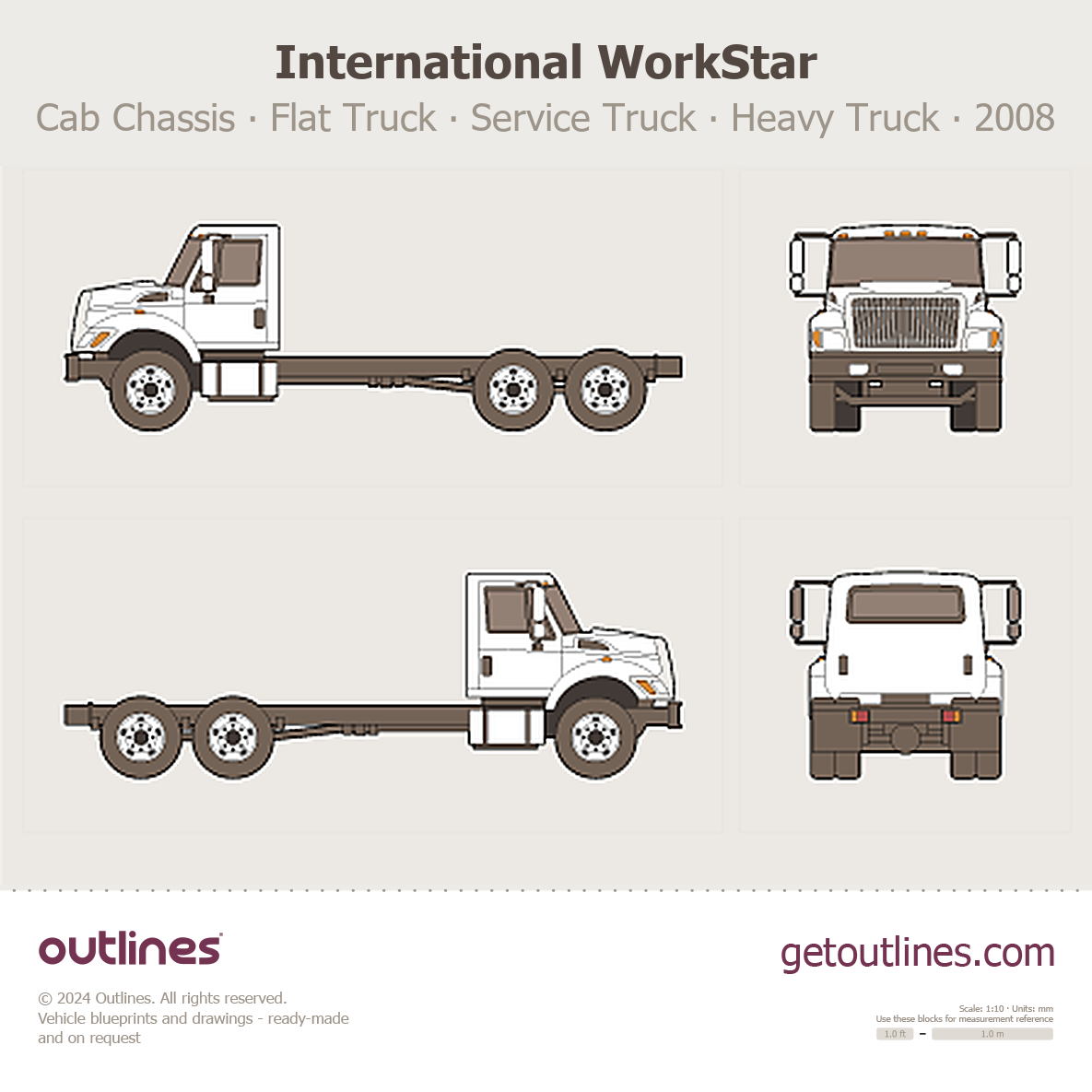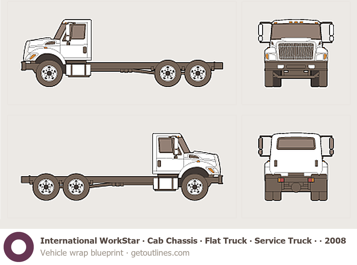 This 2008 International WorkStar Cab Chassis ∙ Flat Truck ∙ Service Truck ∙ Utility Heavy Truck blueprint helps designers, wrap studios, and 3D artists simplify their workflow and save valuable time for creative work instead of routine tasks.