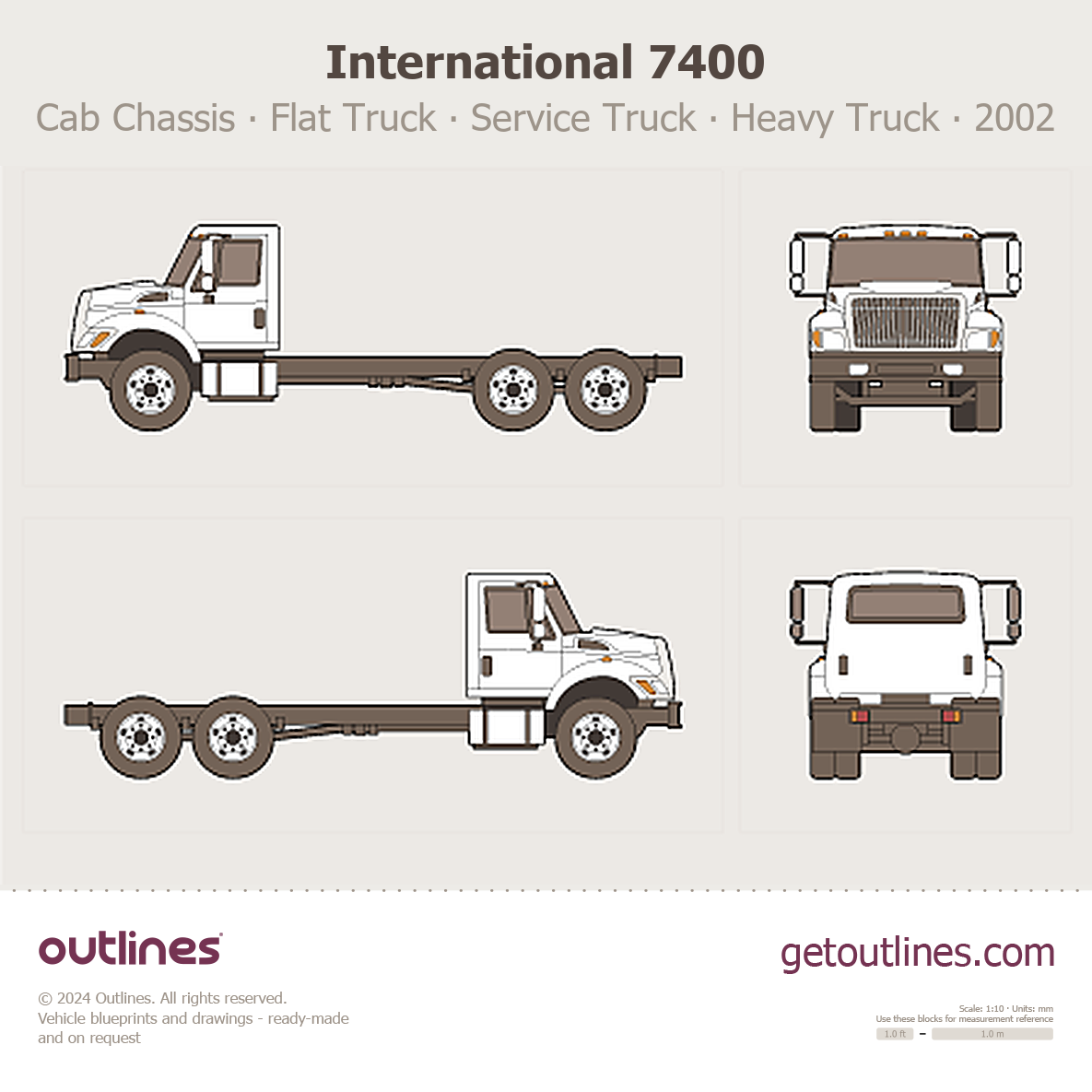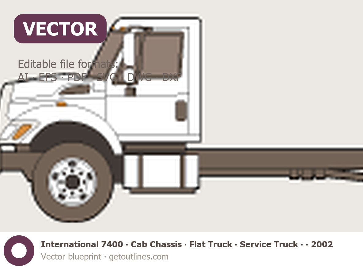 This 2002 International 7400 Cab Chassis ∙ Flat Truck ∙ Service Truck ∙ Utility Heavy Truck blueprint helps designers, wrap studios, and 3D artists simplify their workflow and save valuable time for creative work instead of routine tasks.