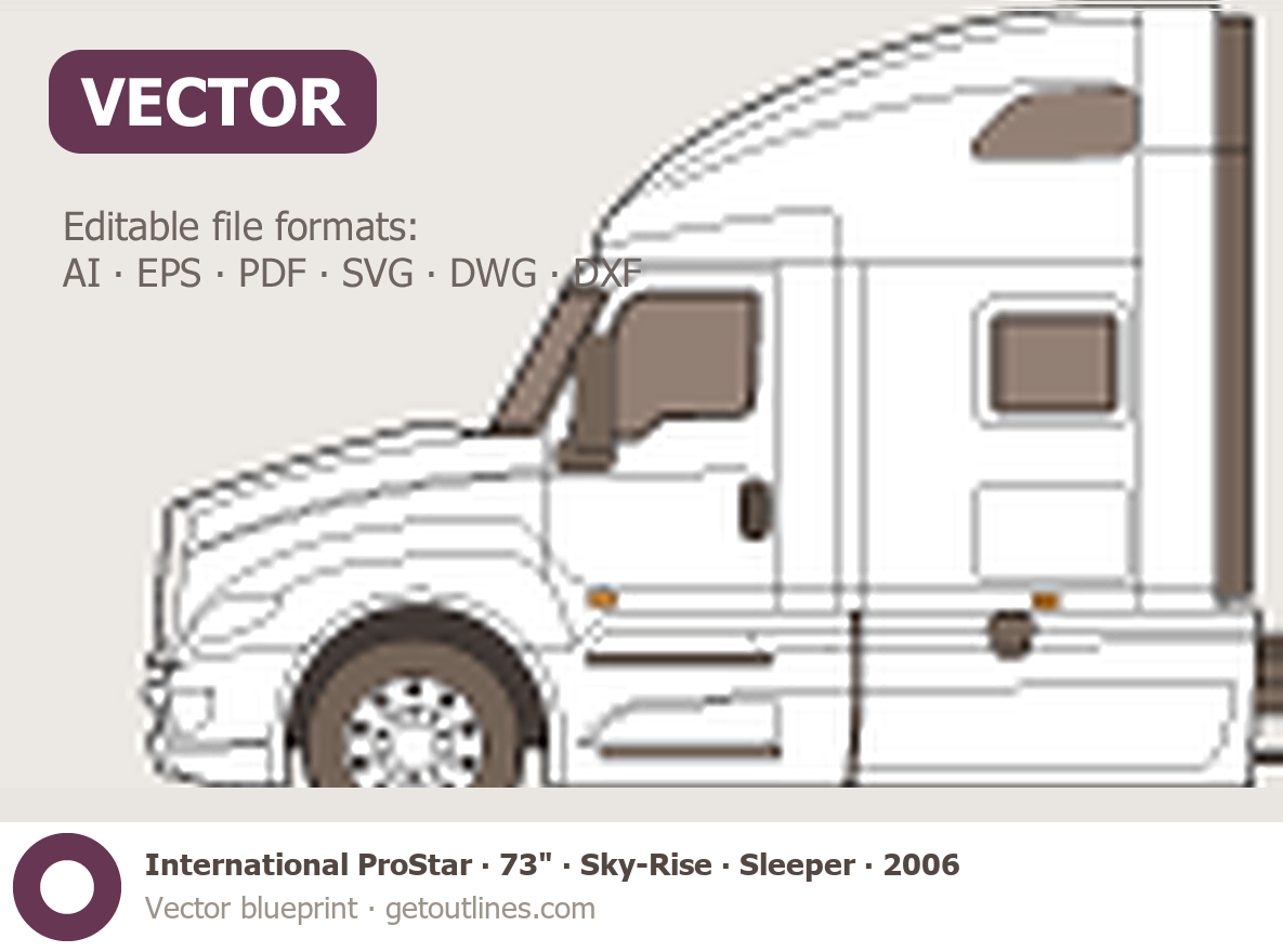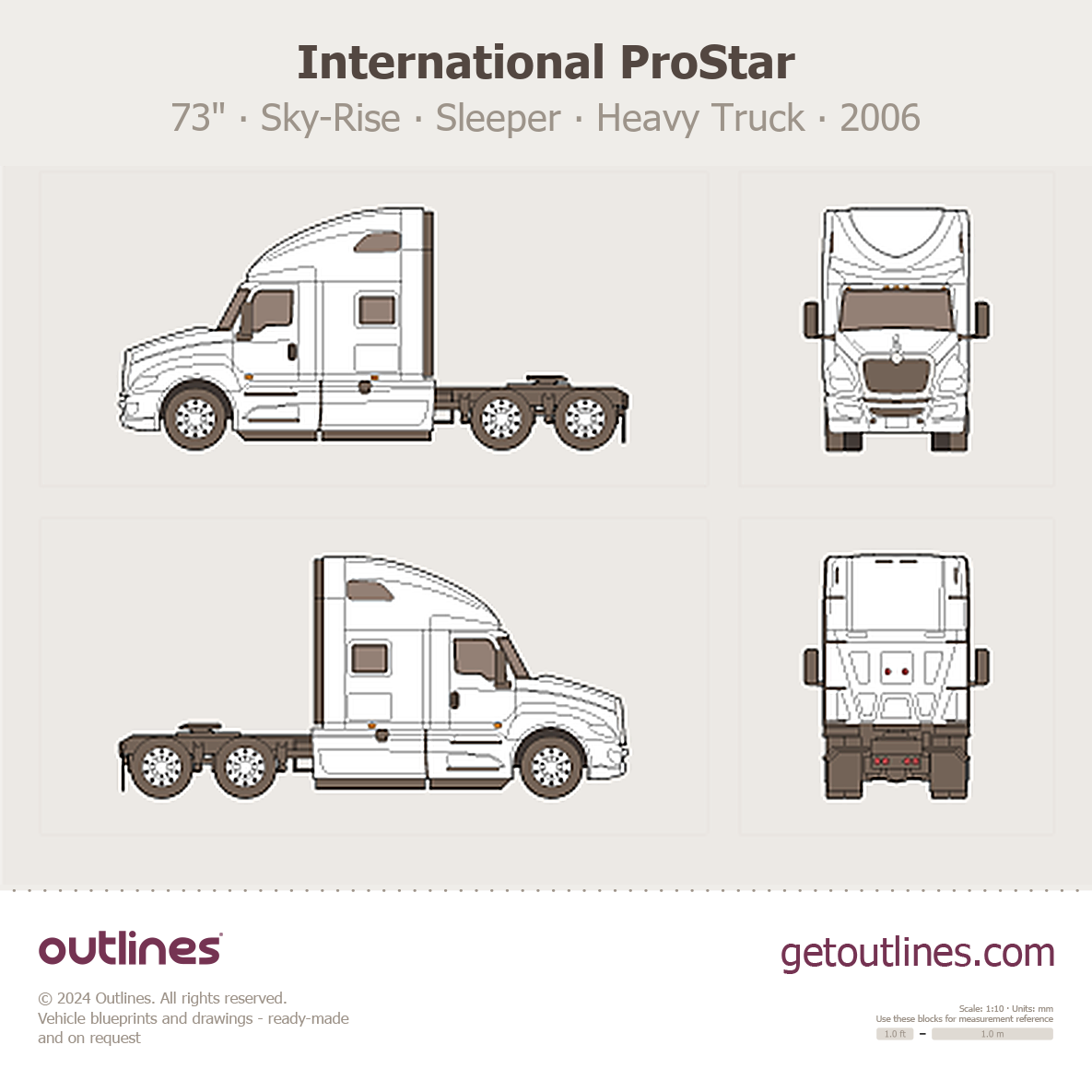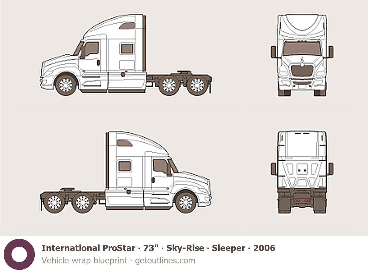 This 2006 International ProStar 73" ∙ Sky-Rise ∙ Sleeper Heavy Truck blueprint helps designers, wrap studios, and 3D artists simplify their workflow and save valuable time for creative work instead of routine tasks.