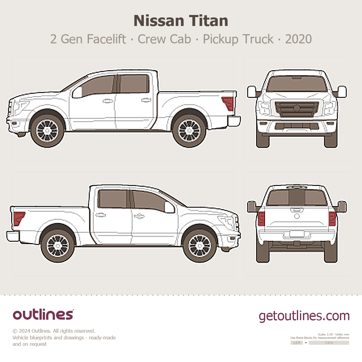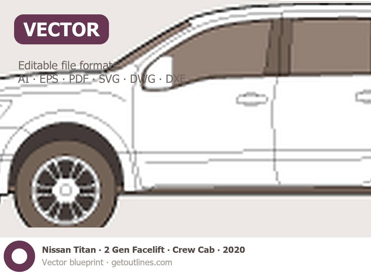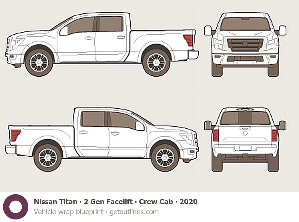 This 2020 Nissan Titan 2 Gen Facelift Crew Cab Pickup Truck blueprint helps designers, wrap studios, and 3D artists simplify their workflow and save valuable time for creative work instead of routine tasks.