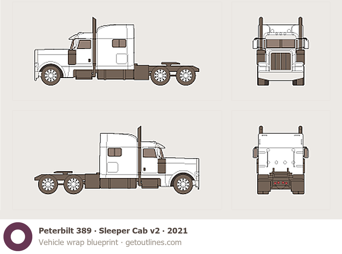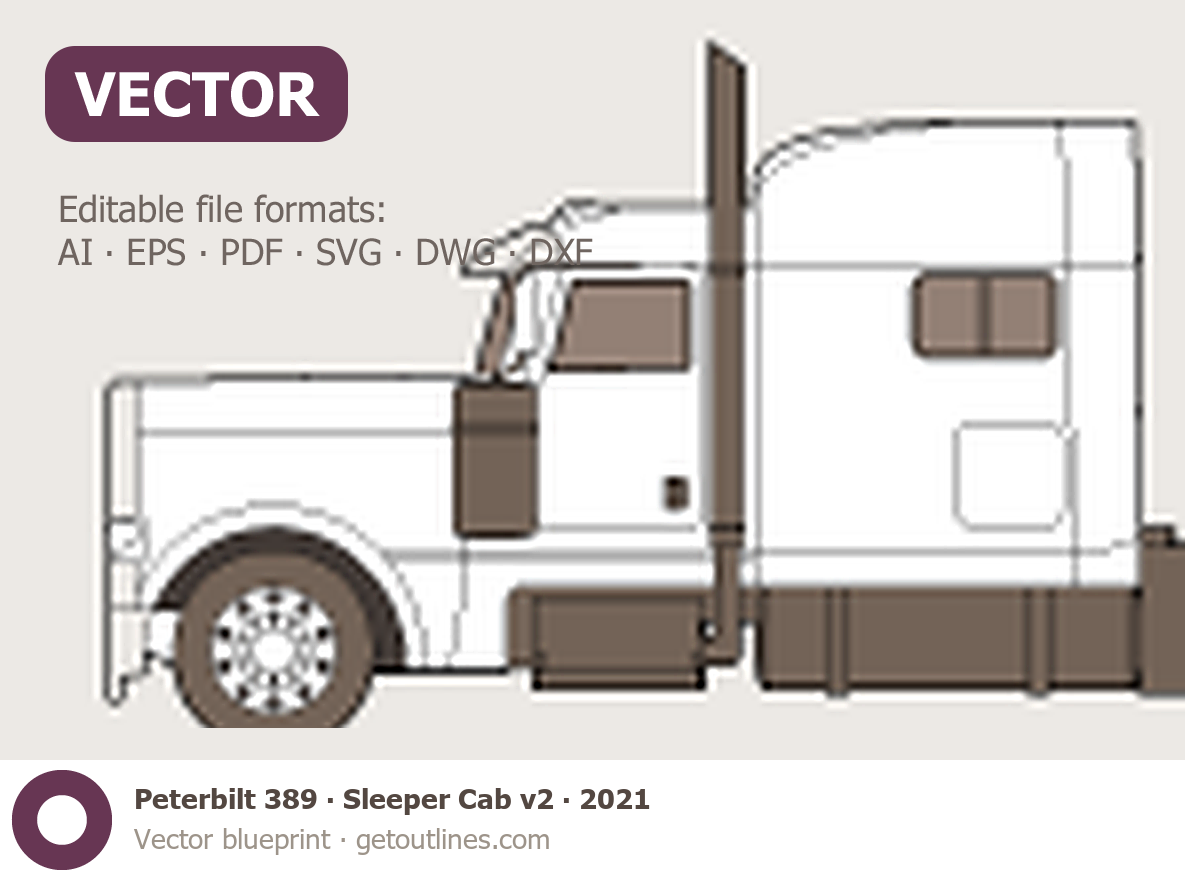 Buy this Peterbilt 389 blueprint and line drawing in high-quality editable vector file formats. Best for 3D and car wrap design.