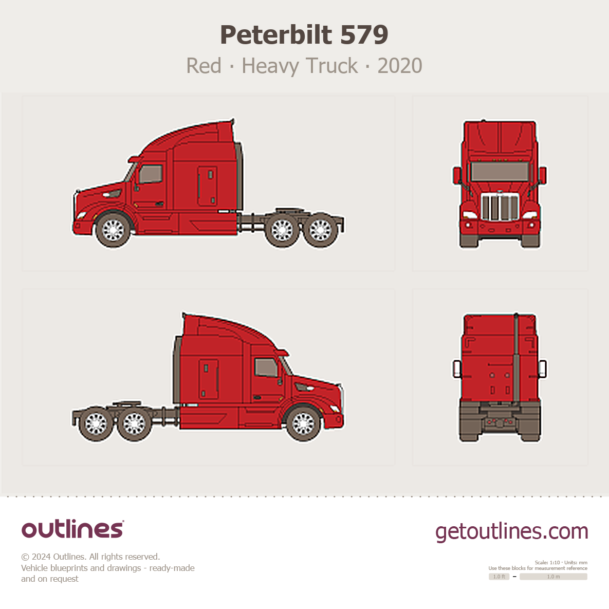 This is a blueprint of the 579, produced by carmaker Peterbilt in 2020 - 2025. It features a Heavy Truck body design and is classified as a Commercial vehicle.