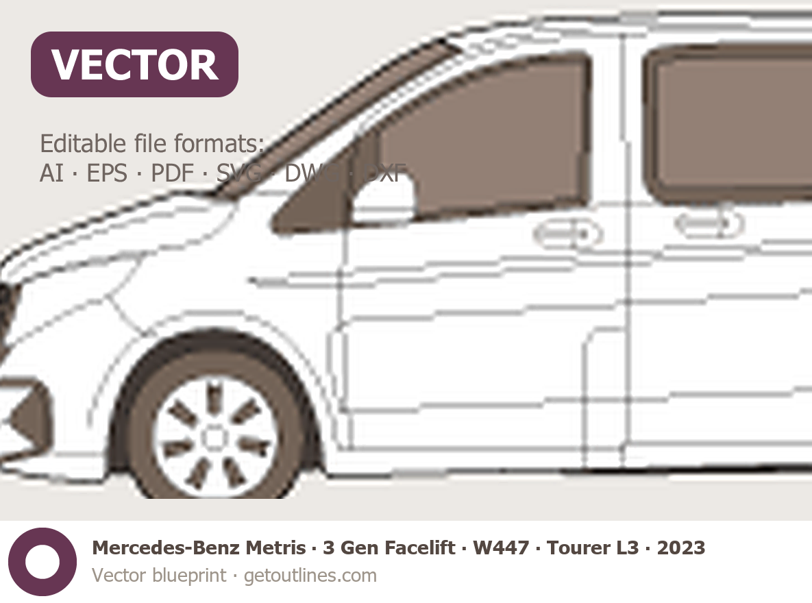 Buy this Mercedes-Benz Metris 3 Gen Facelift ∙ W447 blueprint and line drawing in high-quality editable vector file formats. Best for 3D and car wrap design.