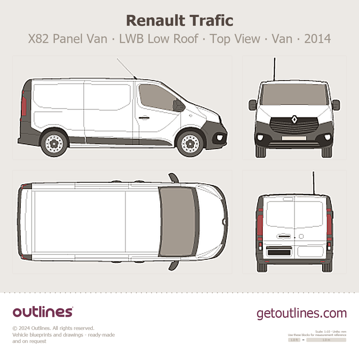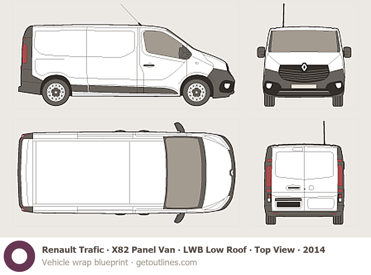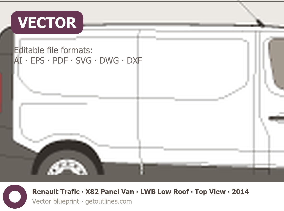 This 2014 Renault Trafic X82 Panel Van LWB Low Roof ∙ Top View Van blueprint helps designers, wrap studios, and 3D artists simplify their workflow and save valuable time for creative work instead of routine tasks.