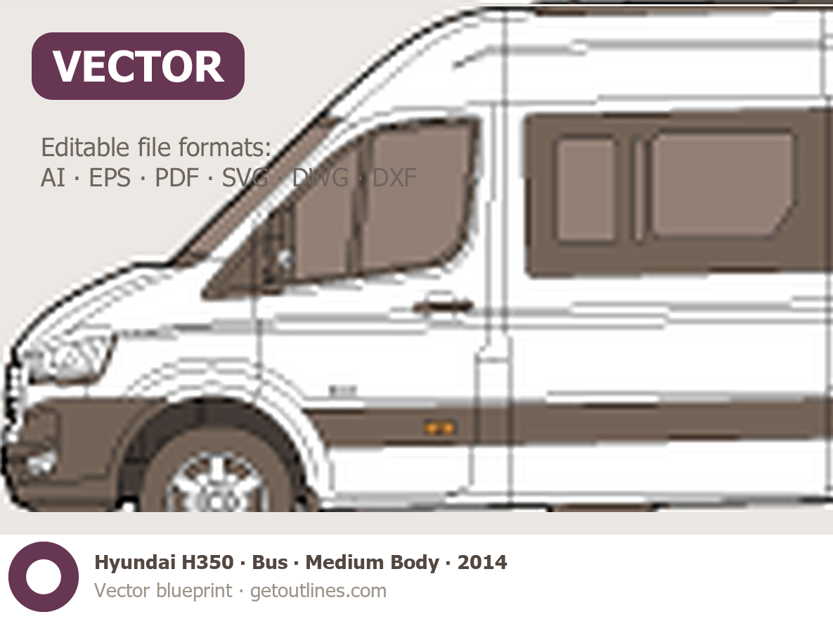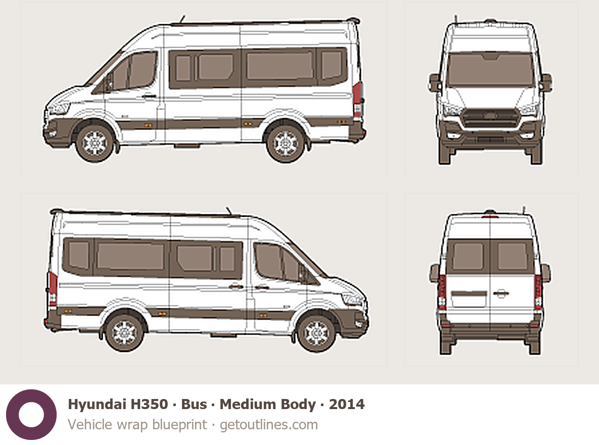 This 2014 Hyundai H350 Bus ∙ Medium Body Van blueprint helps designers, wrap studios, and 3D artists simplify their workflow and save valuable time for creative work instead of routine tasks.