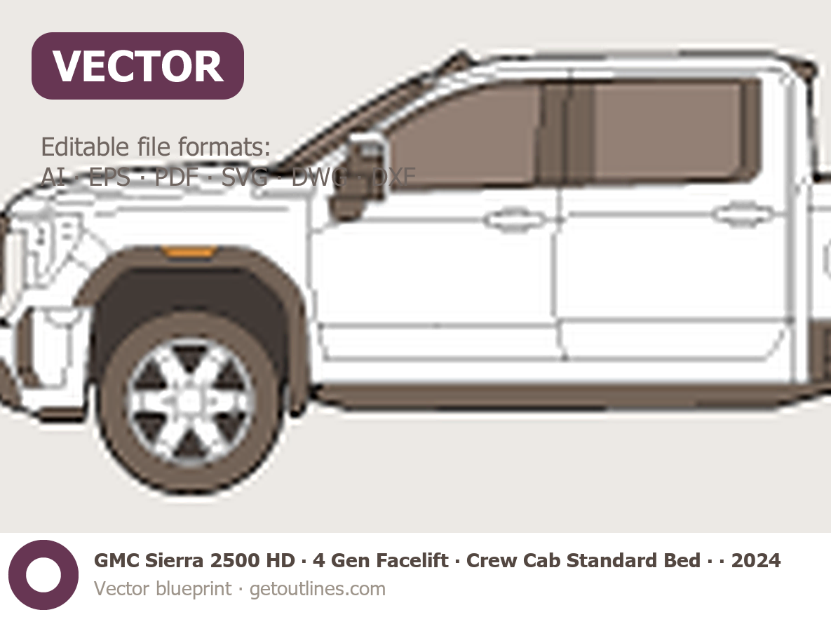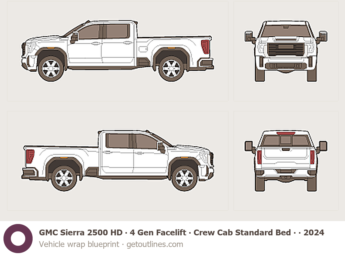 Buy this GMC Sierra 2500 HD 4 Gen Facelift blueprint and line drawing in high-quality editable vector file formats. Best for 3D and car wrap design.