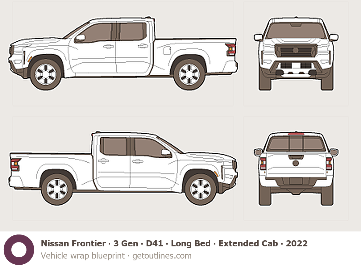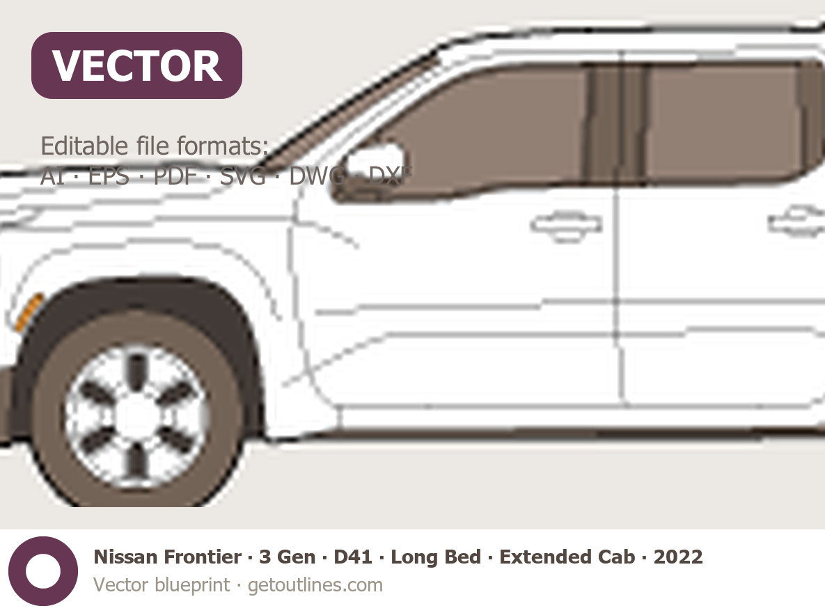 Buy this Nissan Frontier 3 Gen ∙ D41 blueprint and line drawing in high-quality editable vector file formats. Best for 3D and car wrap design.