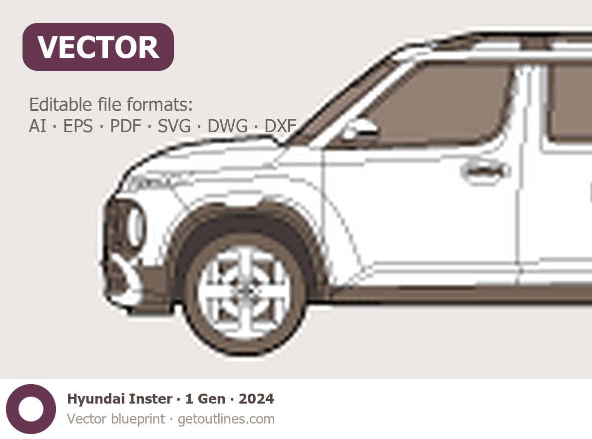 Buy this Hyundai Inster 1 Gen blueprint and line drawing in high-quality editable vector file formats. Best for 3D and car wrap design.