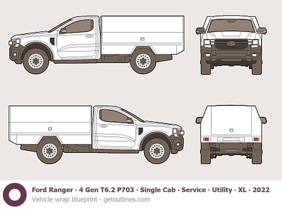This 2022 Ford Ranger 4 Gen T6.2 P703 Single Cab ∙ Service ∙ Utility ∙ XL Pickup Truck blueprint helps designers, wrap studios, and 3D artists simplify their workflow and save valuable time for creative work instead of routine tasks.