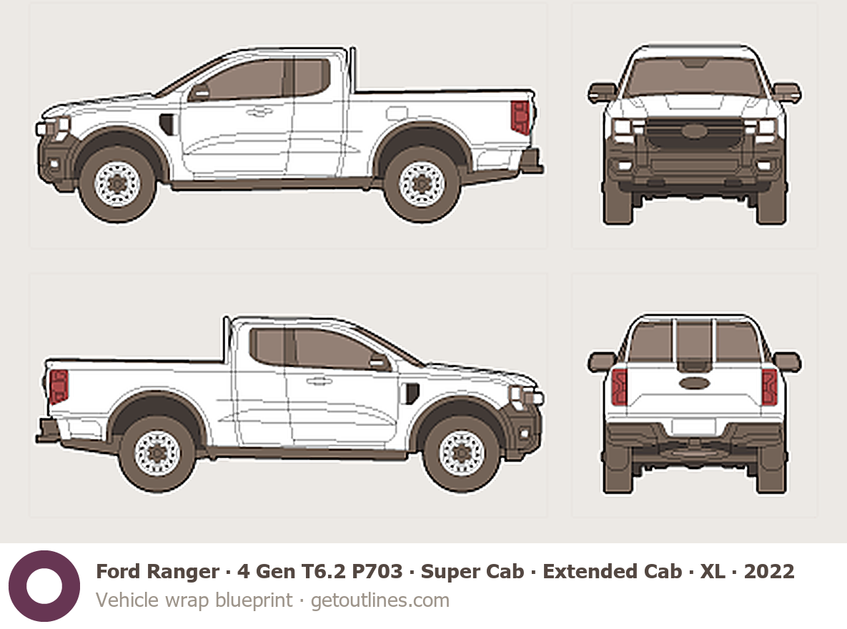 This 2022 Ford Ranger 4 Gen T6.2 P703 Super Cab ∙ Extended Cab ∙ XL Pickup Truck blueprint helps designers, wrap studios, and 3D artists simplify their workflow and save valuable time for creative work instead of routine tasks.