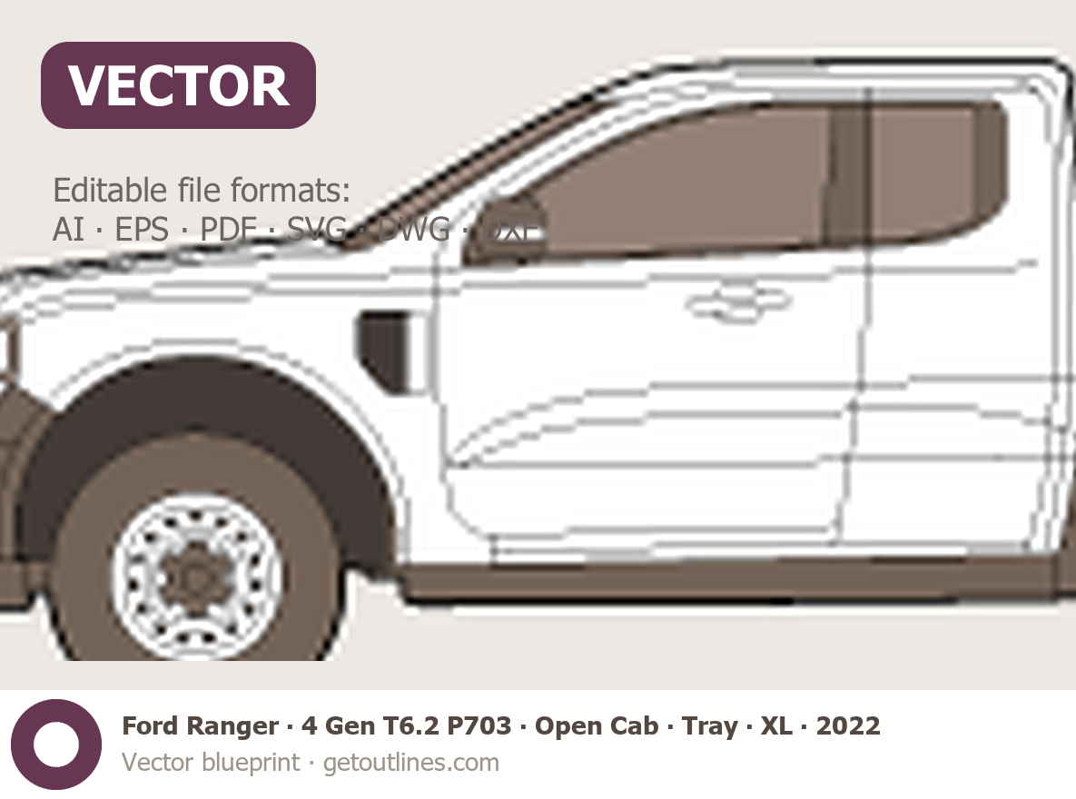 This 2022 Ford Ranger 4 Gen T6.2 P703 Open Cab ∙ Tray ∙ XL Pickup Truck blueprint helps designers, wrap studios, and 3D artists simplify their workflow and save valuable time for creative work instead of routine tasks.