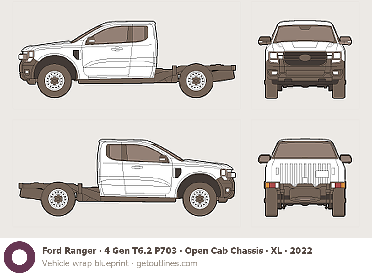 This 2022 Ford Ranger 4 Gen T6.2 P703 Open Cab Chassis ∙ XL Pickup Truck blueprint helps designers, wrap studios, and 3D artists simplify their workflow and save valuable time for creative work instead of routine tasks.