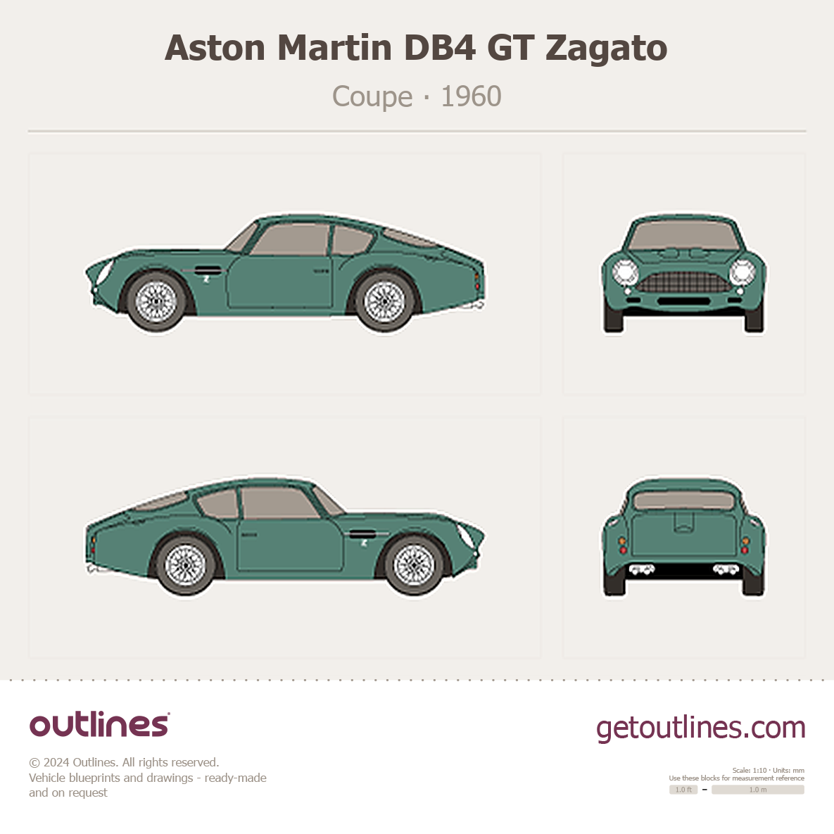 This is a blueprint of the DB4 GT Zagato, produced by carmaker Aston Martin in 1960 - 1963. It features a Coupe body design and is classified as a Sports car vehicle.