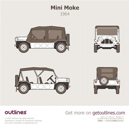 This is a blueprint of the Moke, produced by carmaker Mini in 1964 - 1993. It features a Cabriolet body design and is classified as a Military vehicle.