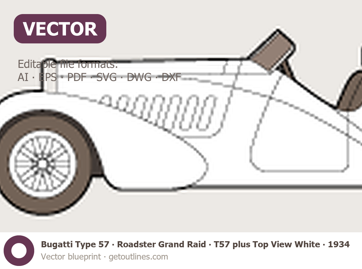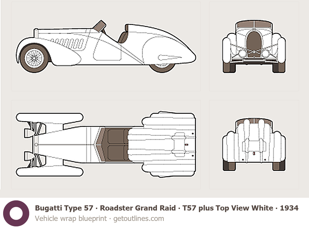 Buy this Bugatti Type 57 Roadster Grand Raid blueprint and line drawing in high-quality editable vector file formats. Best for 3D and car wrap design.