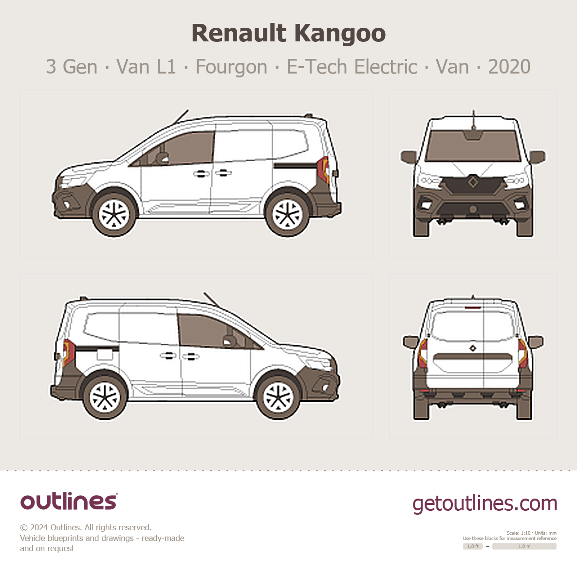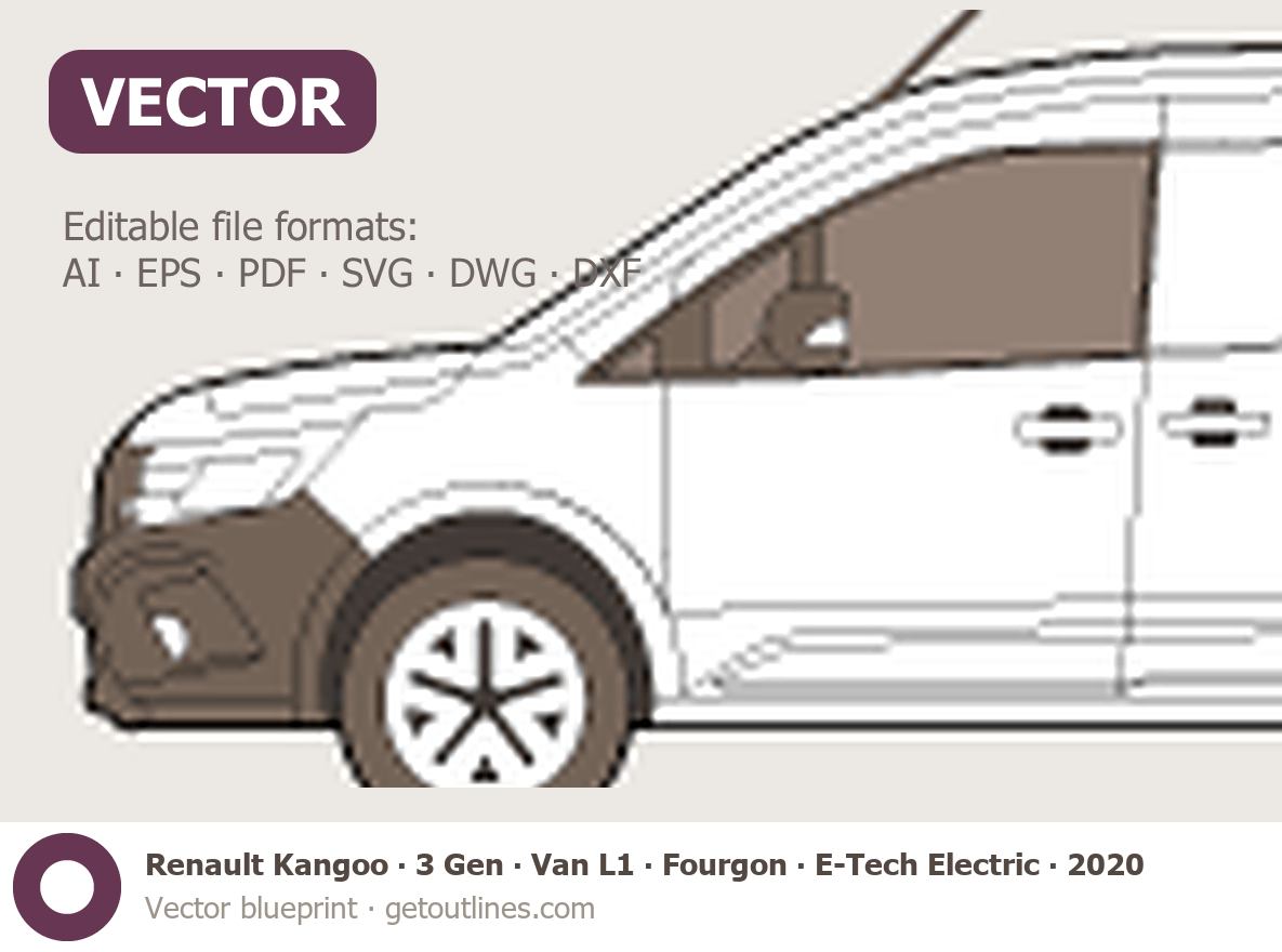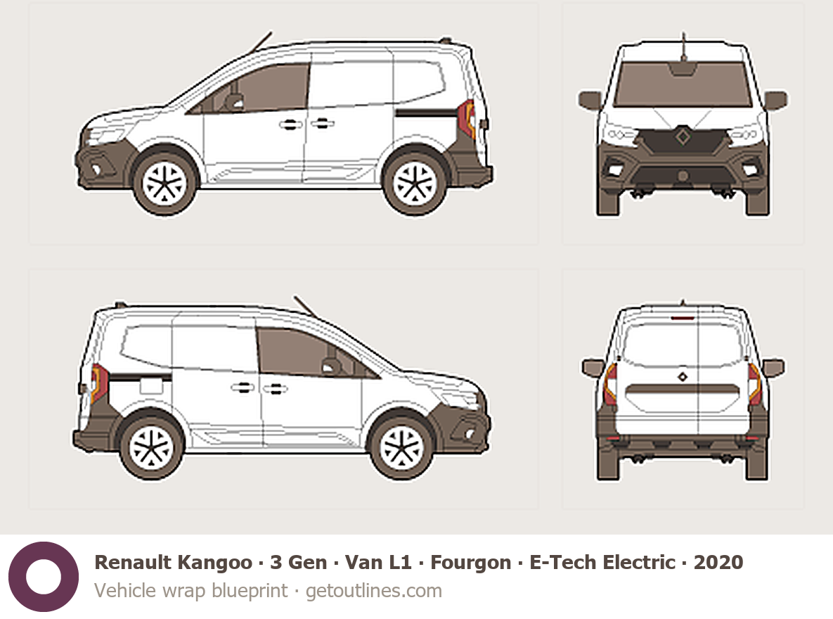 This 2020 Renault Kangoo 3 Gen Van L1 ∙ Fourgon ∙ E‑Tech Electric Van blueprint helps designers, wrap studios, and 3D artists simplify their workflow and save valuable time for creative work instead of routine tasks.