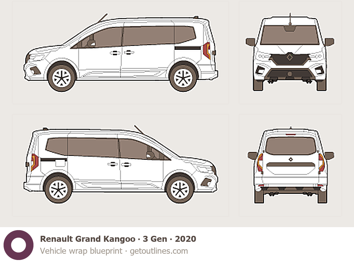 This template is suitable for Renault Grand Kangoo models from 2020 to 2025, including 2020, 2021, 2022, 2023, and 2025 model years, and is commonly used for vehicle wrap and signage design.