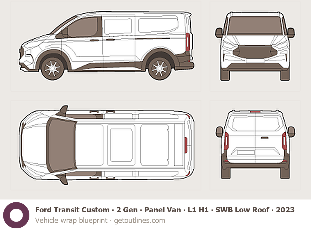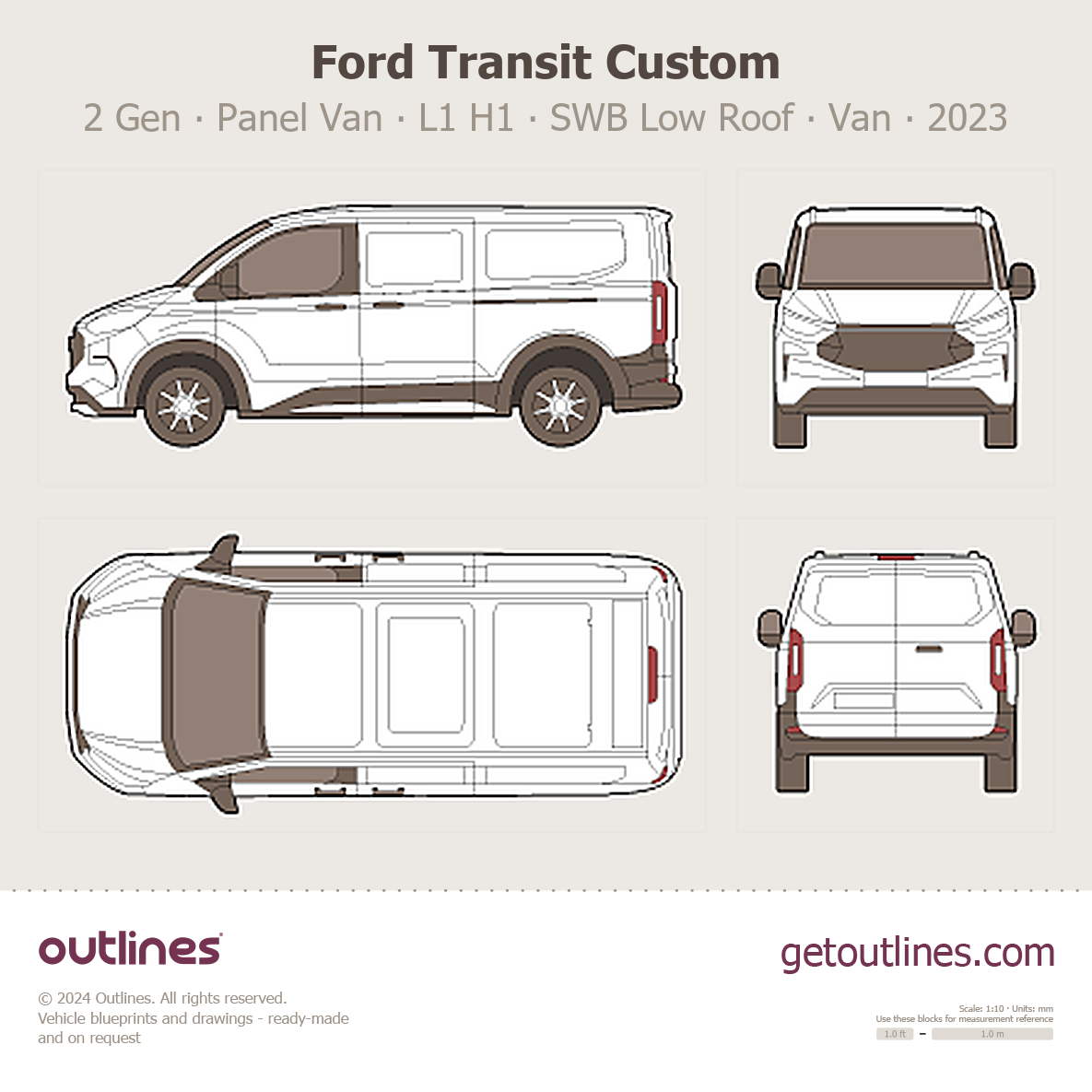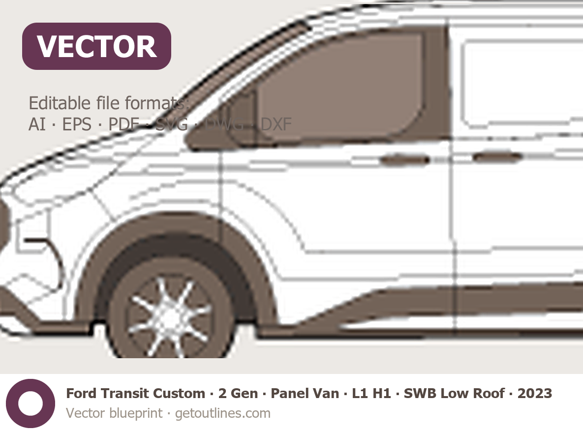 Buy this Ford Transit Custom 2 Gen blueprint and line drawing in high-quality editable vector file formats. Best for 3D and car wrap design.